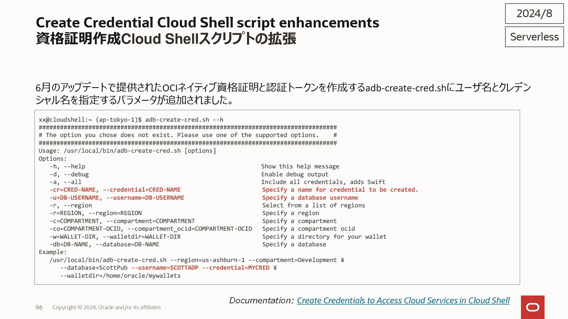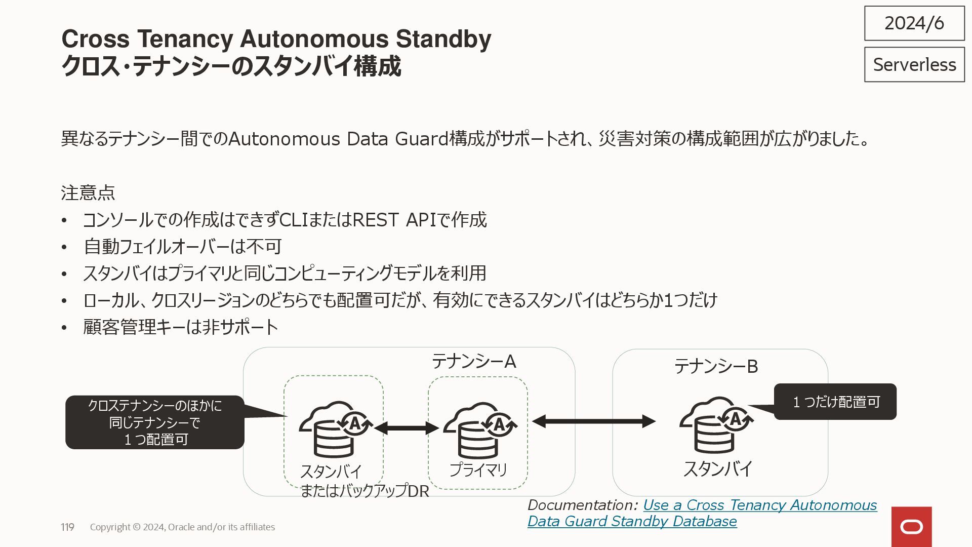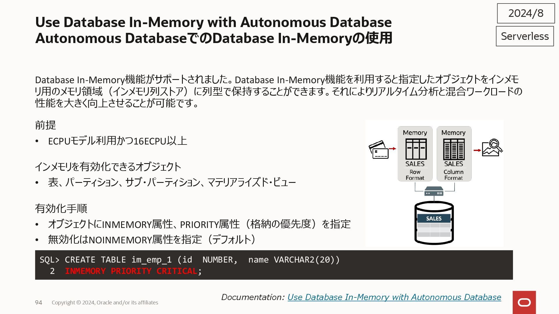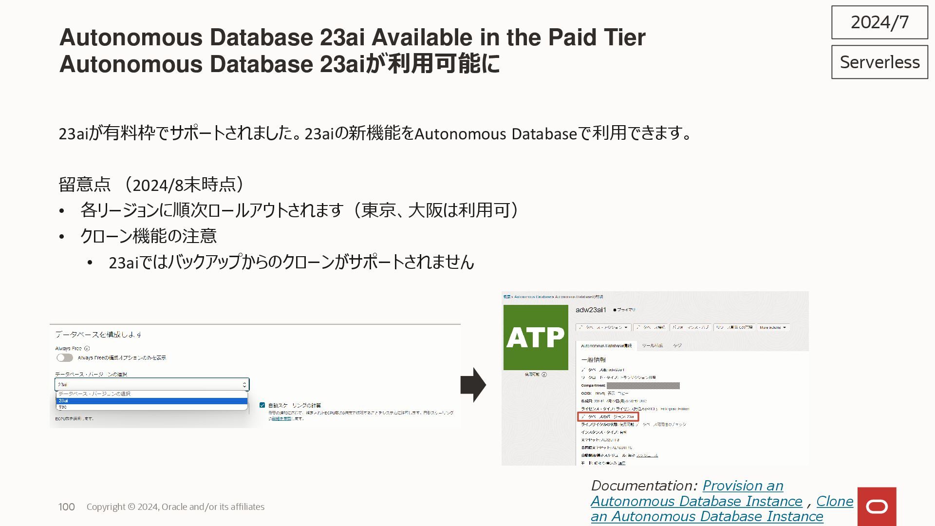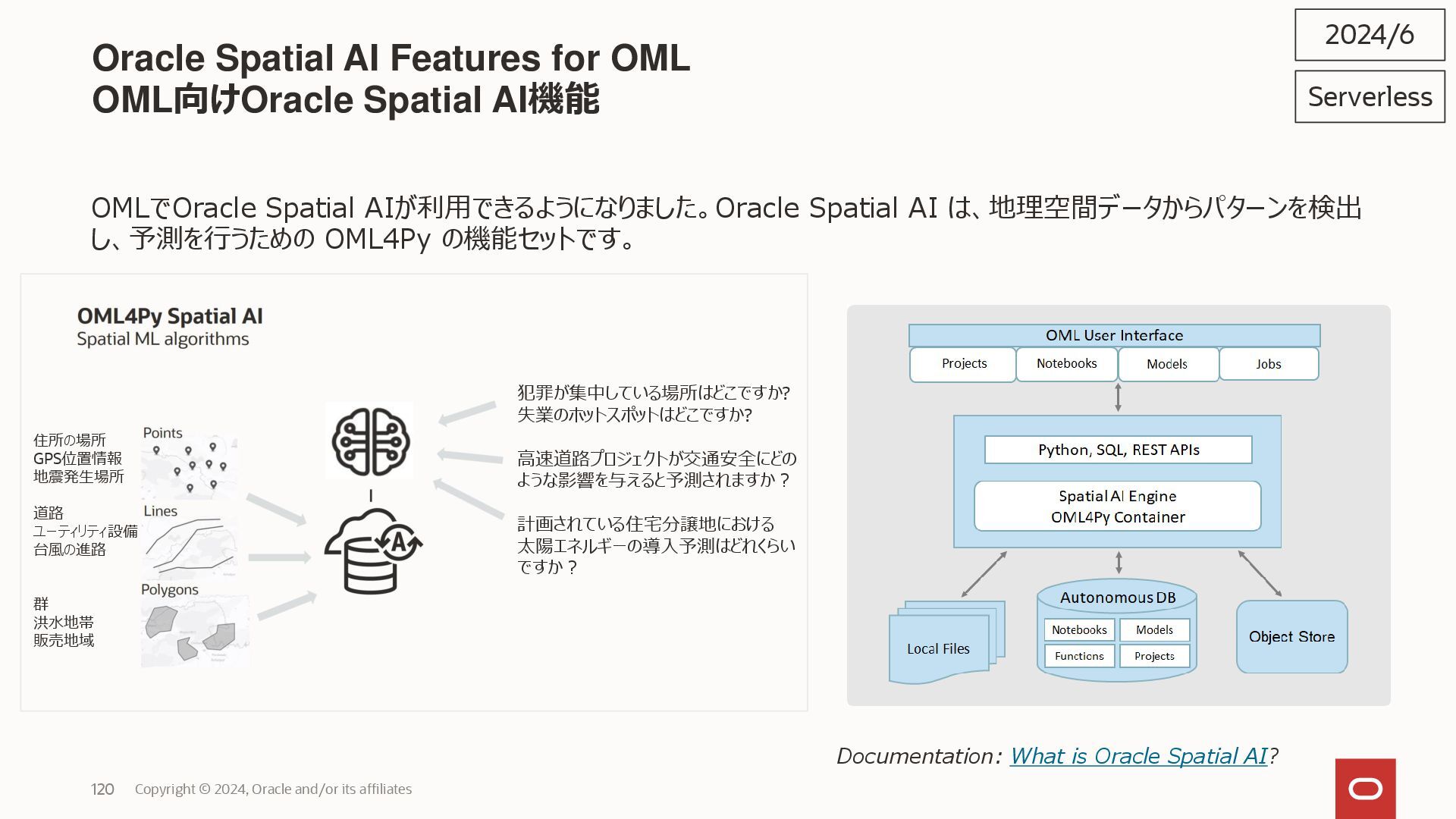 OML4Py メトリック OML4Pyにおいて、機械学習モデルのパフォーマンスの評価ができるメトリックが計算できる関数を含むメトリクスモジュール が使用できるようになりました。 例: confusion_matrix関数を用いて、混同行列を計算 oml.metrics.metric_functionクラスの属性およびメソッドの詳細は、help(oml.metrics.metric_function)を実行す るか、Oracle Machine Learning for Python APIリファレンスを参照してください。 例えば、confusion_matrixについて参照するには、help(oml.metrics.confusion_matrix)を実行します。 2024/12 Documentation: OML4Py Metrics Serverless import oml import pandas as pd from oml.metrics import confusion_matrix y_true = [1, 0, 1, 0, 1, 1, 0, 1, 1, 0] --実際の値 y_pred = [1, 1, 1, 0, 0, 1, 1, 0, 0, 0] --予測値 sample_weight = [1, 2, 1, 1, 1, 1, 1, 3, 1, 1] –-各サンプルの重み pdf = pd.DataFrame({'y_true': y_true 'y_pred': y_pred, 'sample_weight': sample_weight}) --モデル評価のために実際の値、予 測値、サンプルの重みを含んだデータフレーム df = oml.create(pdf, ‘test_class’) --モデル評価に使用するために、OMLで使用されるデータフレーム confusion_matrix(df, 'y_true', 'y_pred', sample_weight='sample_weight') --混同行列の計算