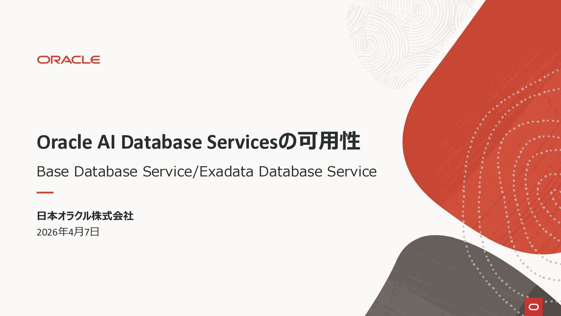 この資料は、Oracle AI Databaseデータベースのクラウド・サービス、Base Database Service と Exadata Database Serviceの可用性について説明しています。