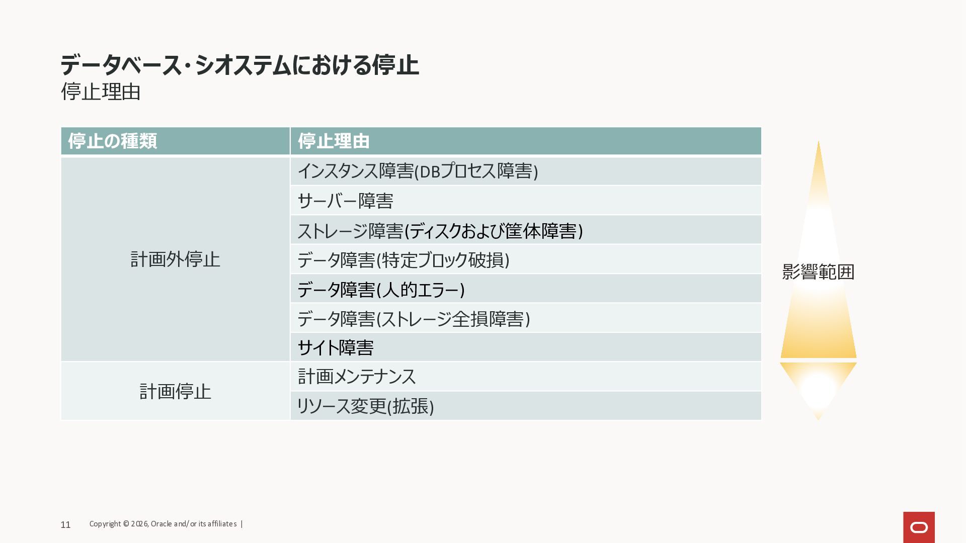 サイト障害 計画停止 計画メンテナンス リソース変更(拡張) データベース・シオステムにおける停止 影響範囲 Copyright © 2026, Oracle and/or its affiliates | 11