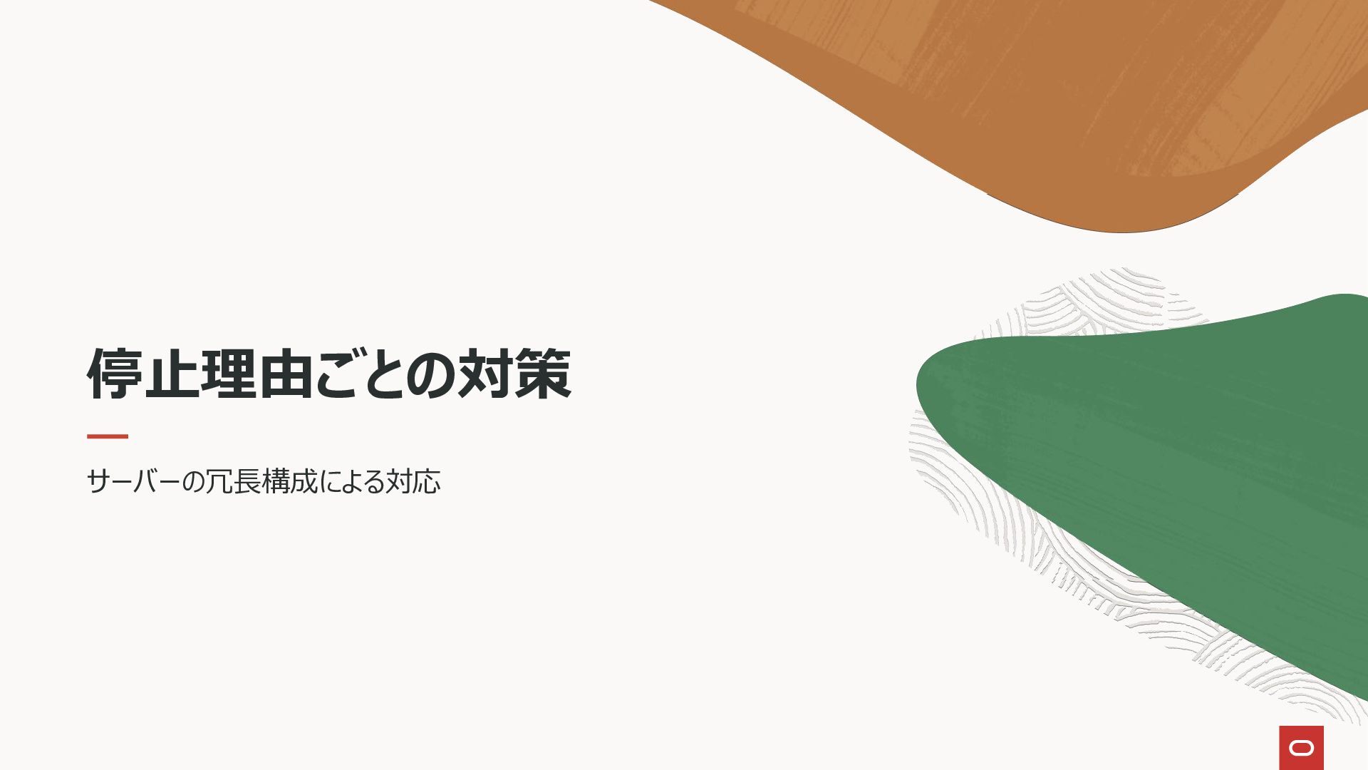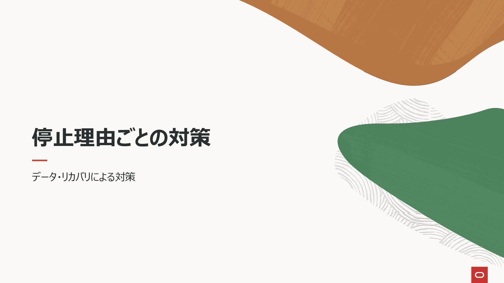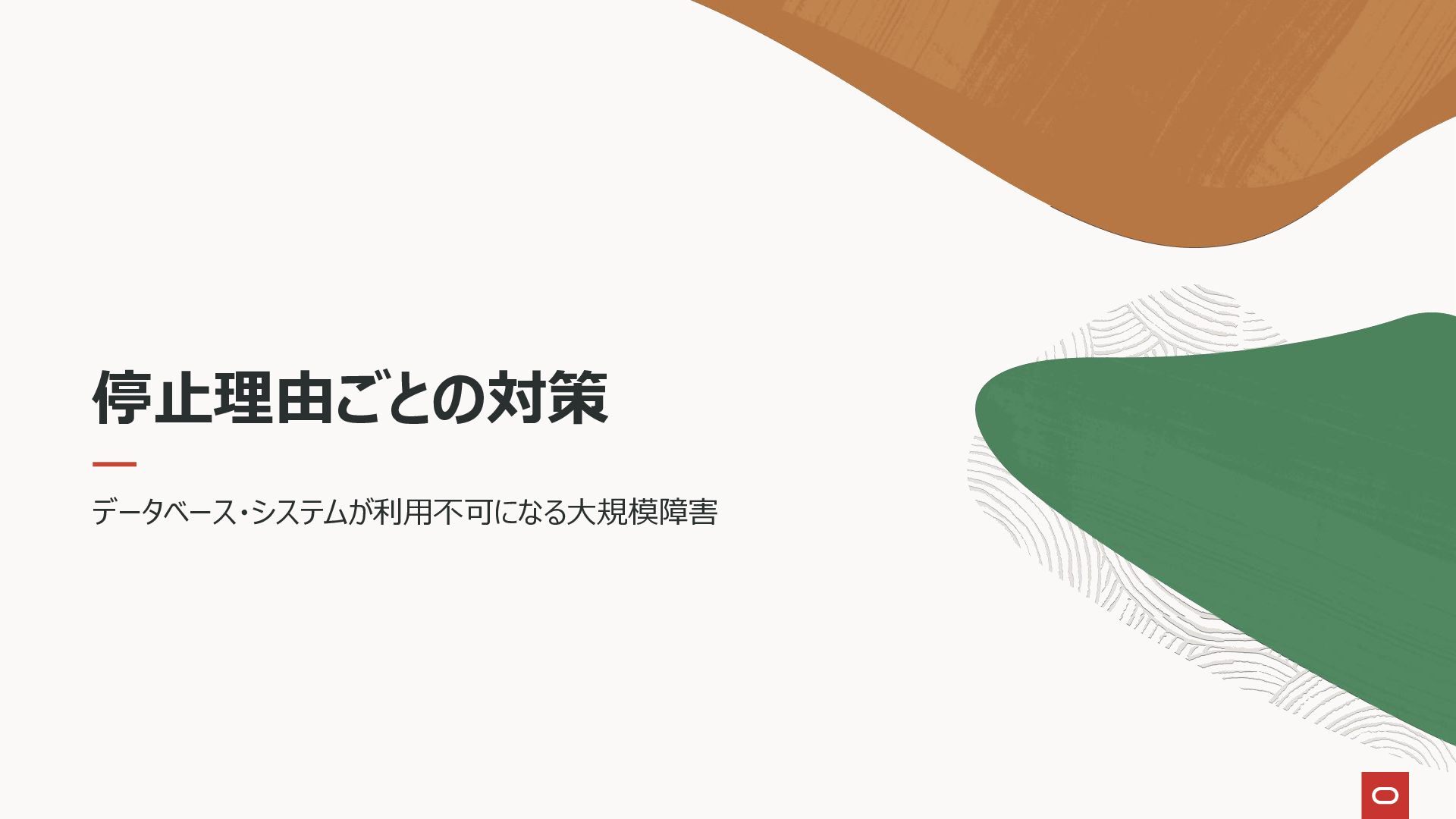 8. 停止理由 停止の種類 停止理由 計画外停止 インスタンス障害(DBプロセス障害) サーバー障害 ストレージ障害(ディスクおよび筐体障害) データ障害(特定ブロック破損) データ障害(人的エラー) データ障害(ストレージ全損障害)