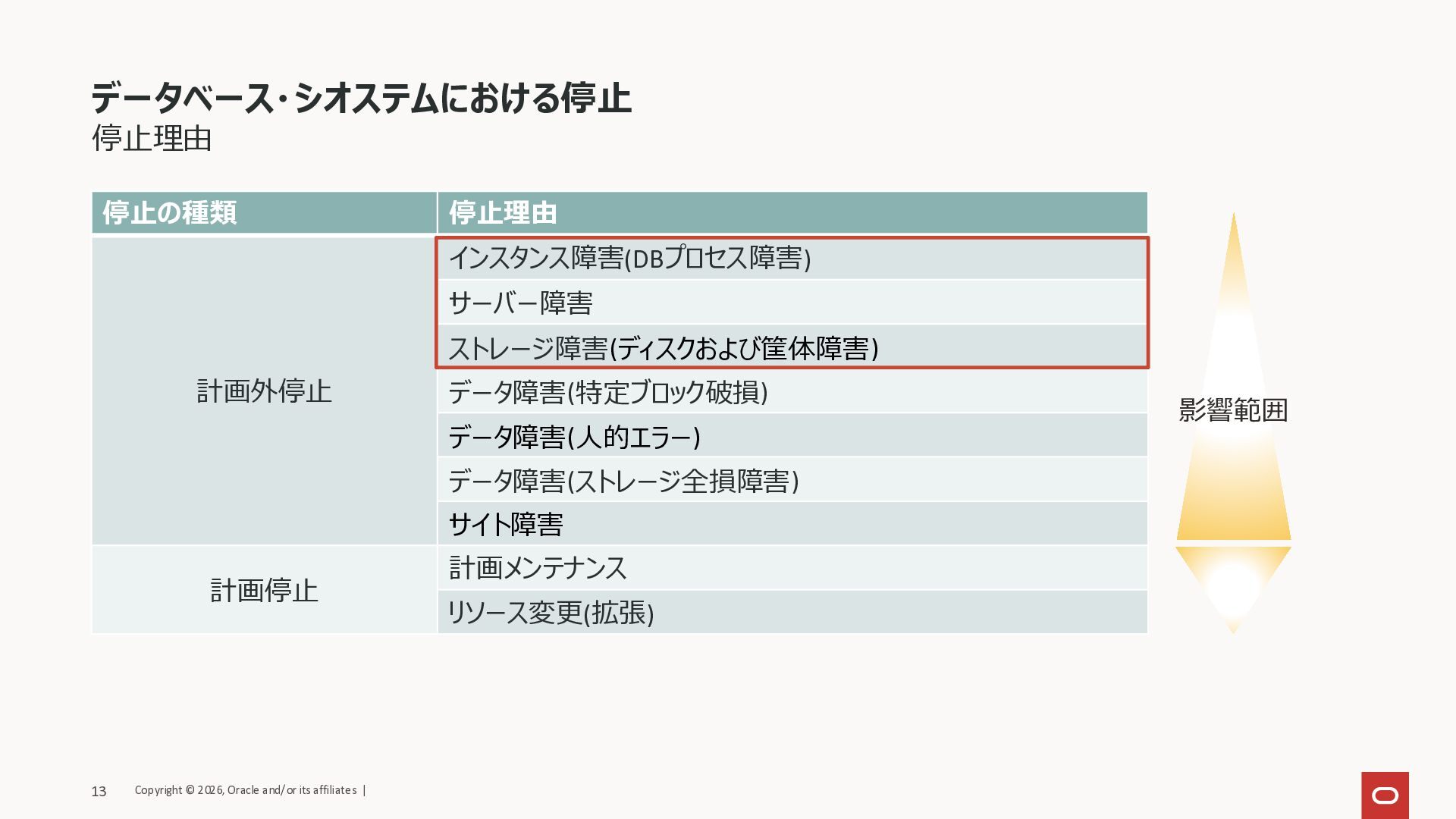 サイト障害 計画停止 計画メンテナンス リソース変更(拡張) データベース・シオステムにおける停止 影響範囲 Copyright © 2026, Oracle and/or its affiliates | 13