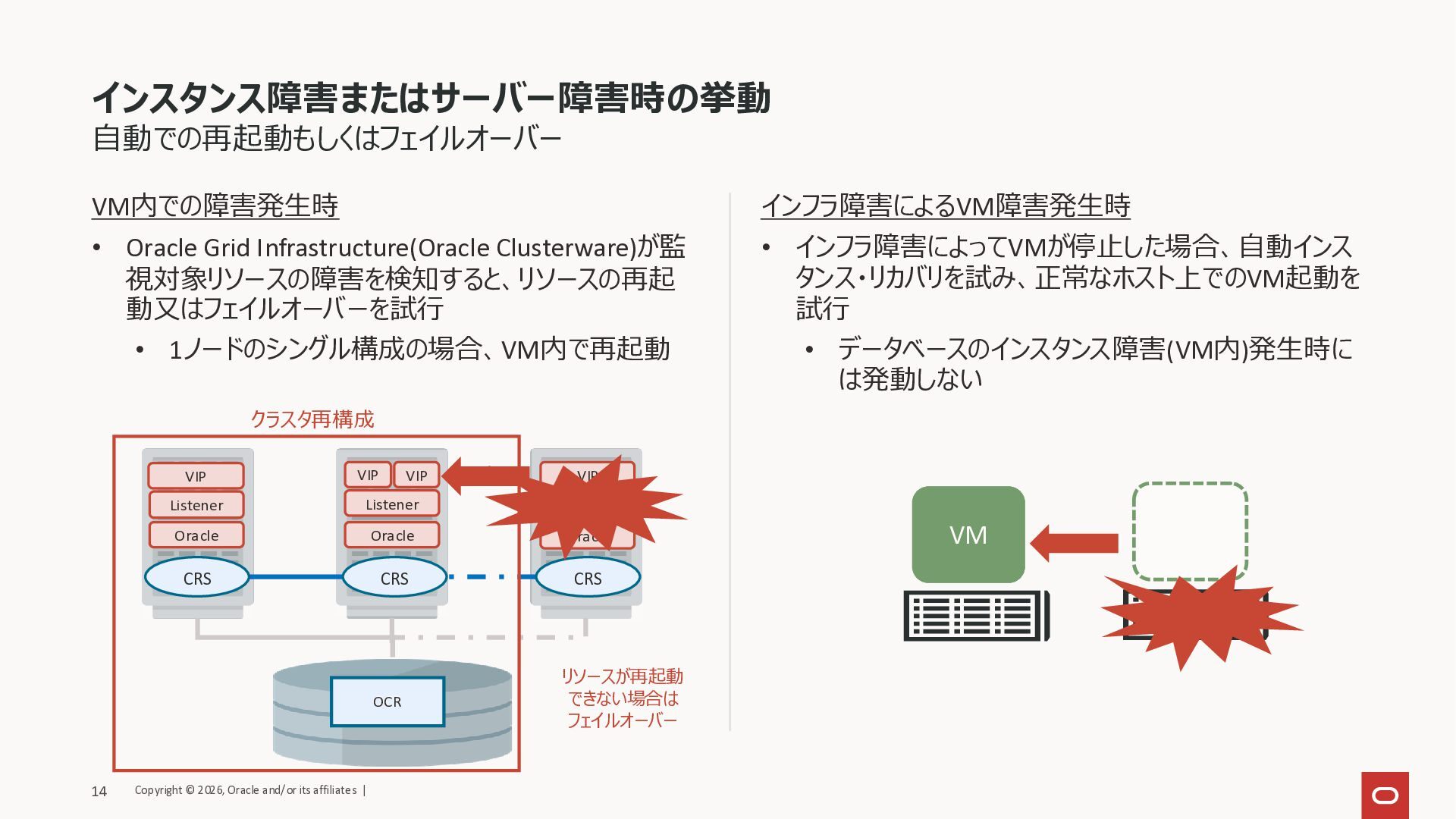 1ノードのシングル構成の場合、VM内で再起動 インフラ障害によるVM障害発生時 • インフラ障害によってVMが停止した場合、自動インス タンス・リカバリを試み、正常なホスト上でのVM起動を 試行 • データベースのインスタンス障害(VM内)発生時に は発動しない 自動での再起動もしくはフェイルオーバー OCR CRS CRS CRS Listener Oracle Listener Oracle Listener Oracle VIP VIP VIP VIP リソースが再起動 できない場合は フェイルオーバー クラスタ再構成 VM Copyright © 2026, Oracle and/or its affiliates | 14
