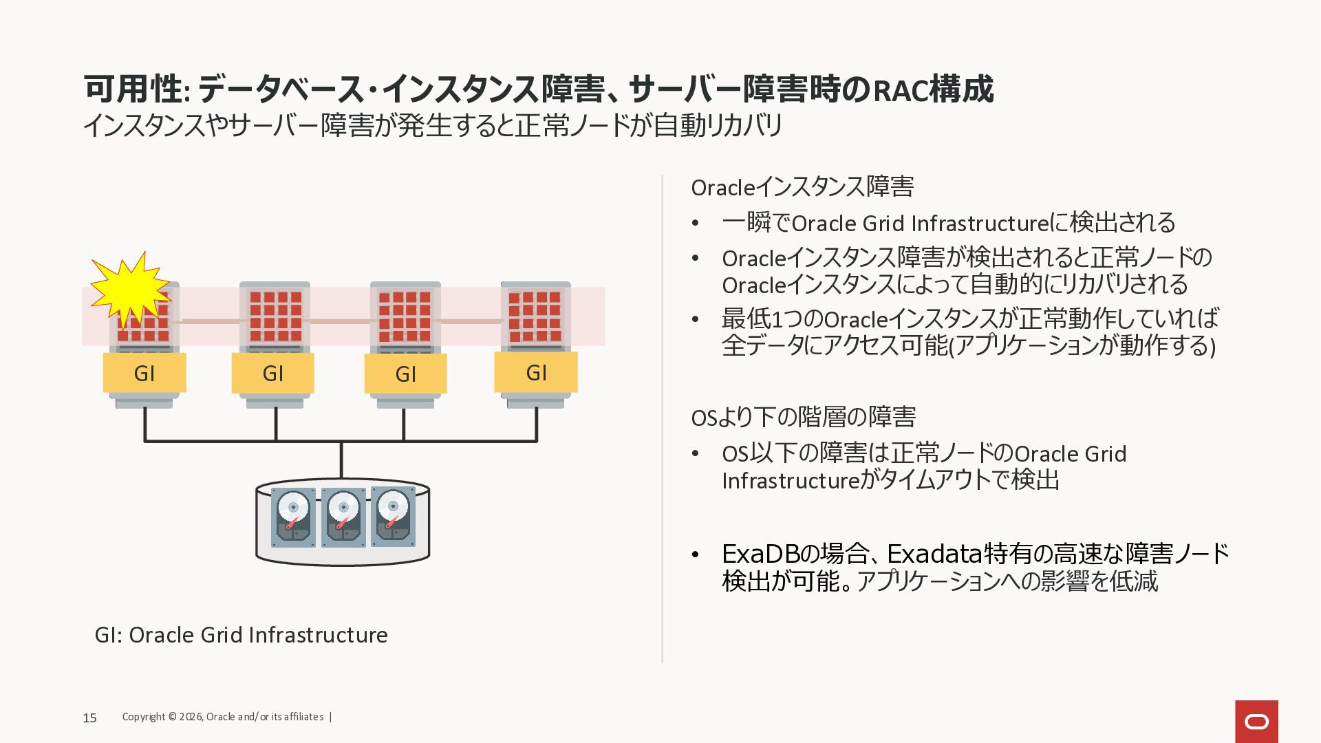 • 最低1つのOracleインスタンスが正常動作していれば 全データにアクセス可能(アプリケーションが動作する) OSより下の階層の障害 • OS以下の障害は正常ノードのOracle Grid Infrastructureがタイムアウトで検出 • ExaDBの場合、Exadata特有の高速な障害ノード 検出が可能。アプリケーションへの影響を低減 インスタンスやサーバー障害が発生すると正常ノードが自動リカバリ GI GI GI GI GI: Oracle Grid Infrastructure Copyright © 2026, Oracle and/or its affiliates | 15