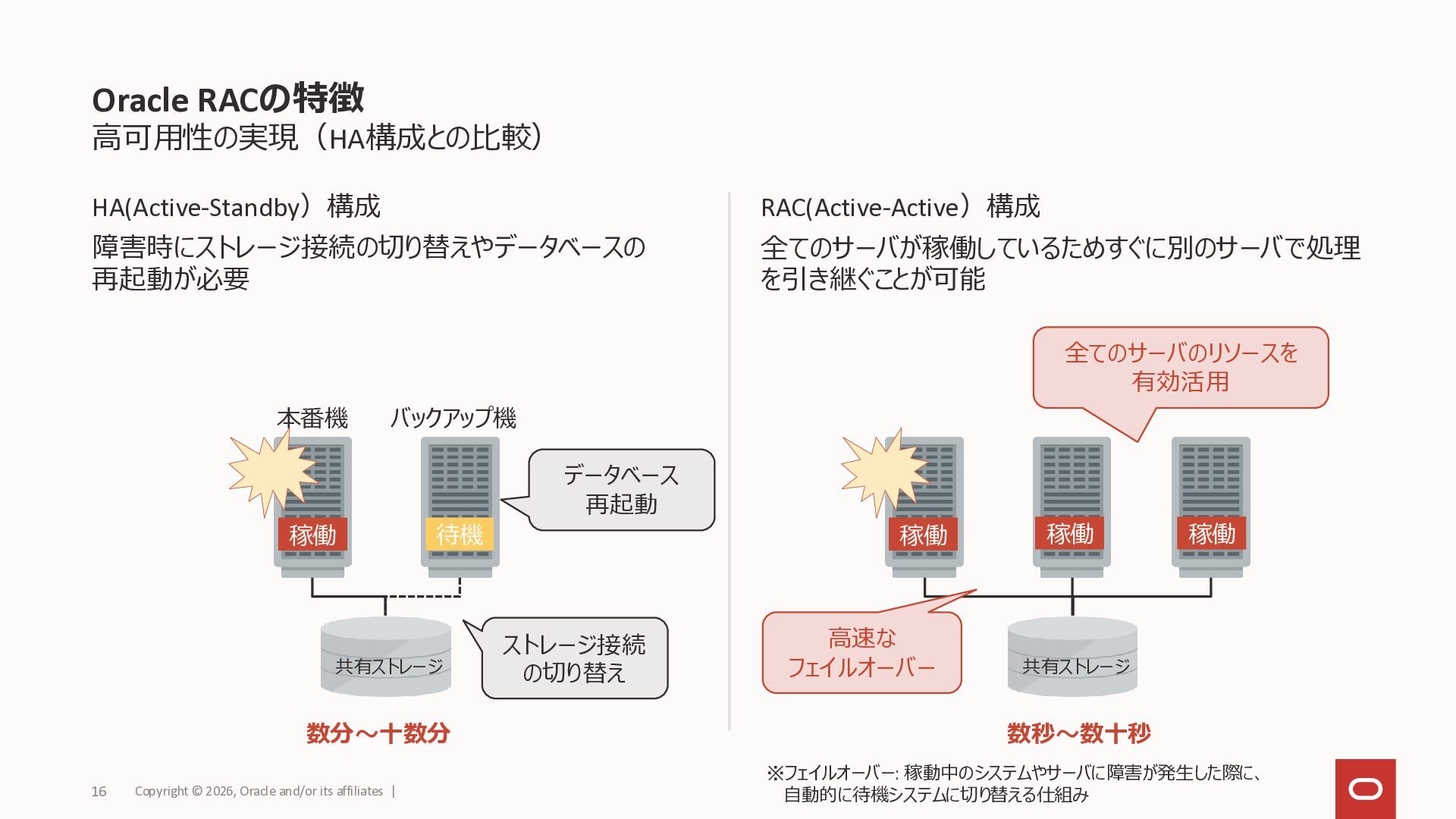 © 2026, Oracle and/or its affiliates | 16 共有ストレージ 共有ストレージ ストレージ接続 の切り替え 稼働 数分〜十数分 本番機 バックアップ機 待機 データベース 再起動 稼働 稼働 稼働 全てのサーバのリソースを 有効活用 高速な フェイルオーバー 数秒〜数十秒 ※フェイルオーバー: 稼動中のシステムやサーバに障害が発生した際に、 自動的に待機システムに切り替える仕組み
