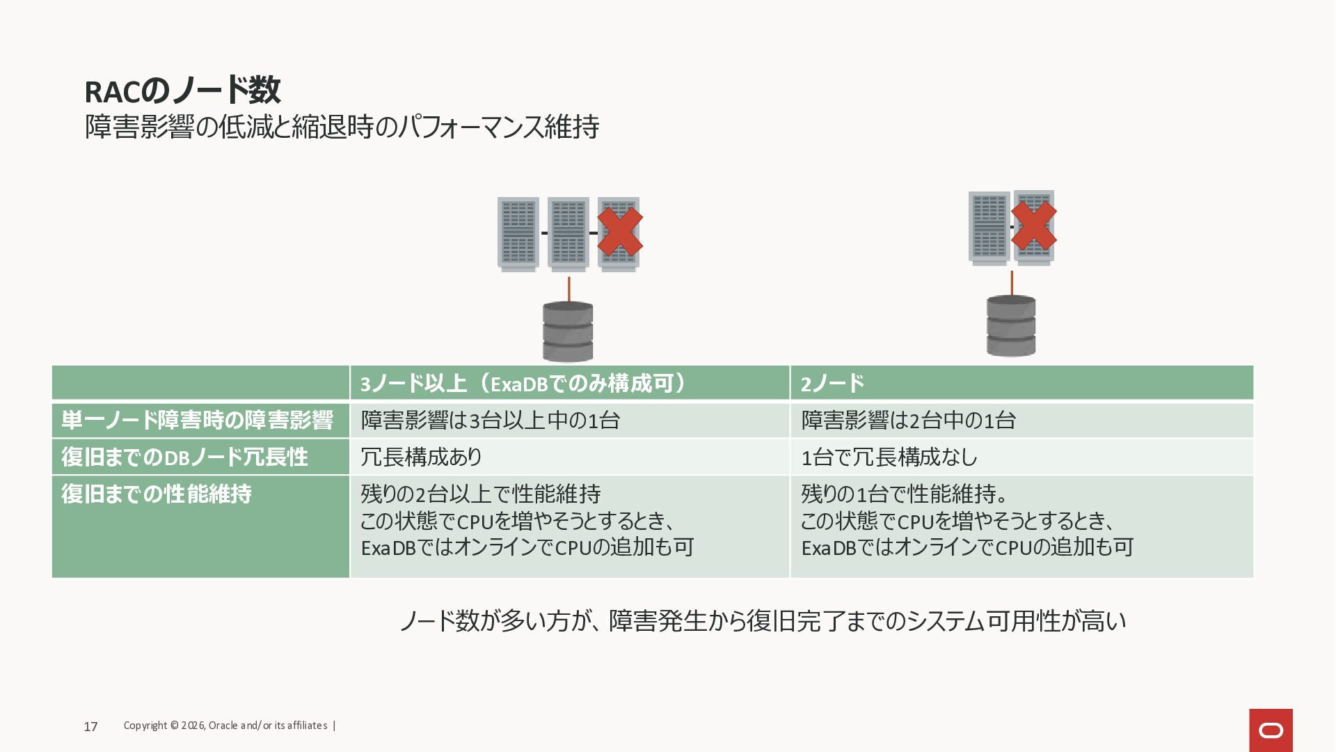 復旧までの性能維持 残りの2台以上で性能維持 この状態でCPUを増やそうとするとき、 ExaDBではオンラインでCPUの追加も可 残りの1台で性能維持。 この状態でCPUを増やそうとするとき、 ExaDBではオンラインでCPUの追加も可 ノード数が多い方が、障害発生から復旧完了までのシステム可用性が高い Copyright © 2026, Oracle and/or its affiliates | 17