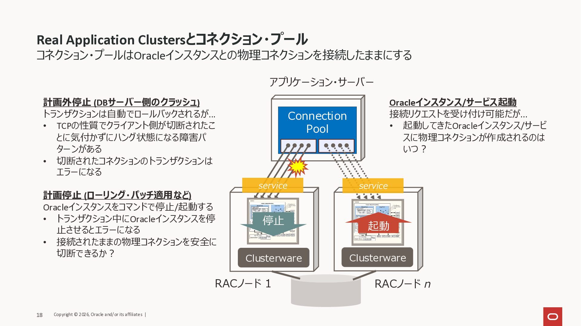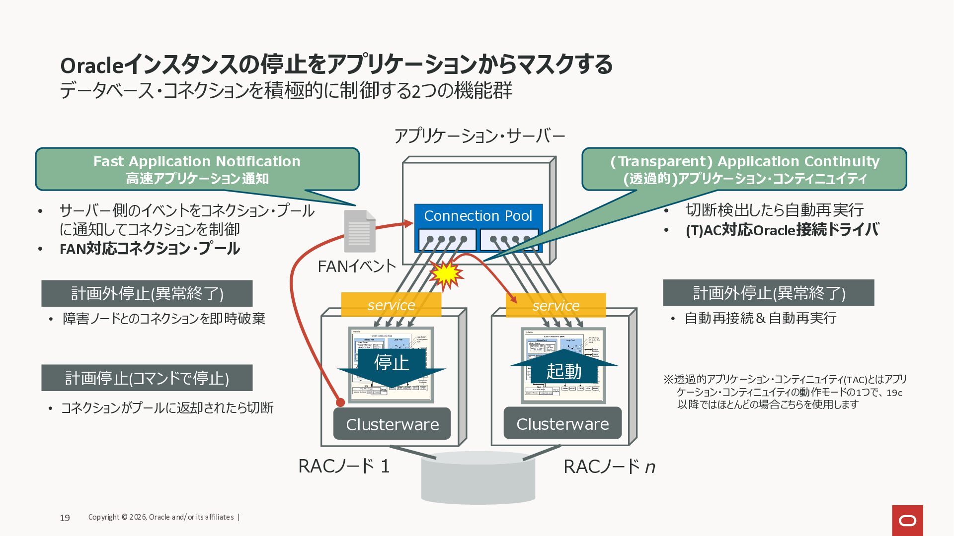 アプリケーション・サーバー Clusterware Clusterware service service 停止 起動 計画外停止 (DBサーバー側のクラッシュ) トランザクションは自動でロールバックされるが... • TCPの性質でクライアント側が切断されたこ とに気付かずにハング状態になる障害パ ターンがある • 切断されたコネクションのトランザクションは エラーになる 計画停止 (ローリング・パッチ適用など) Oracleインスタンスをコマンドで停止/起動する • トランザクション中にOracleインスタンスを停 止させるとエラーになる • 接続されたままの物理コネクションを安全に 切断できるか? Oracleインスタンス/サービス起動 接続リクエストを受け付け可能だが... • 起動してきたOracleインスタンス/サービ スに物理コネクションが作成されるのは いつ? Copyright © 2026, Oracle and/or its affiliates | 18