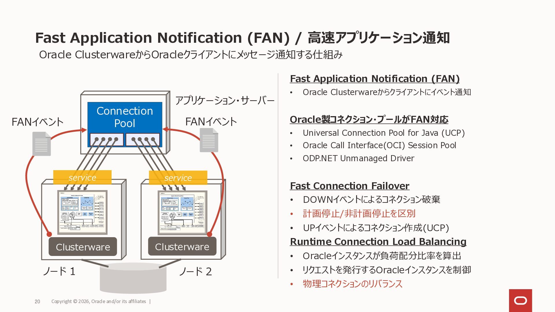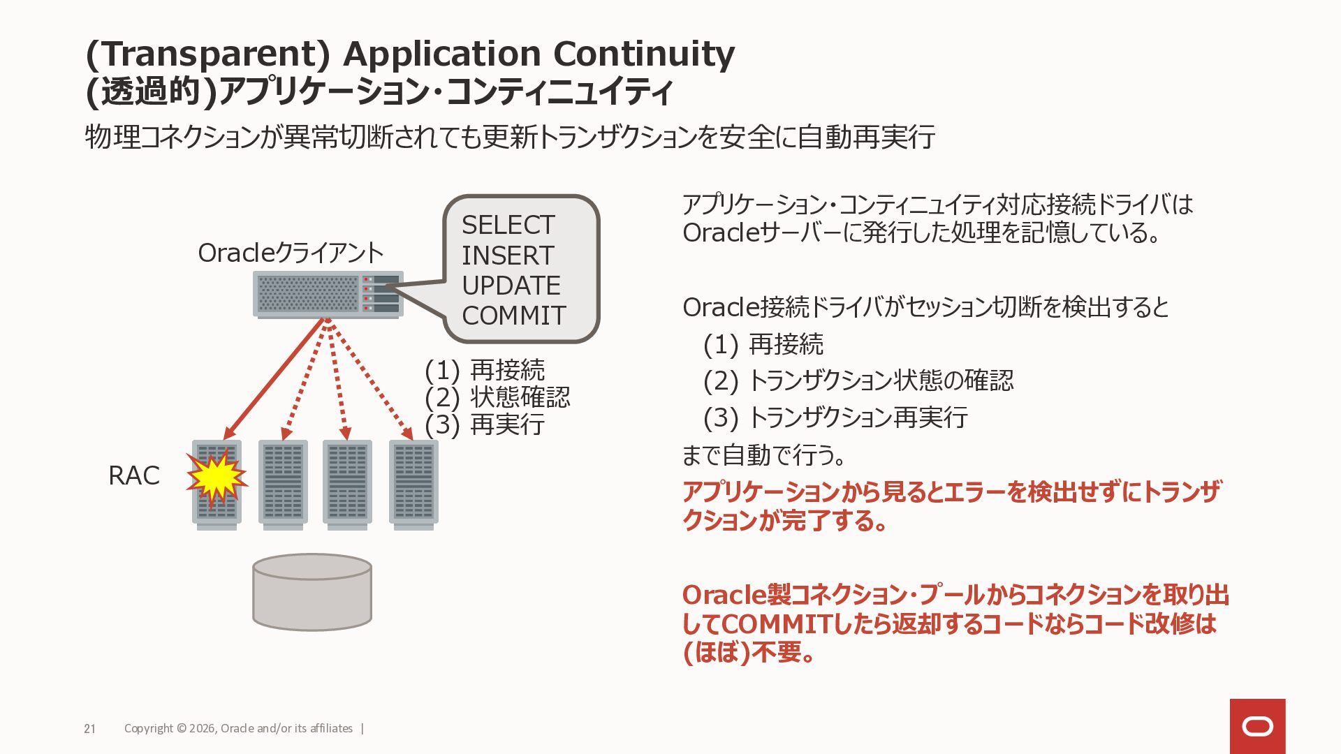 (Transparent) Application Continuity (透過的)アプリケーション・コンティニュイティ RACノード 1 RACノード n Fast Application Notification 高速アプリケーション通知 • 切断検出したら自動再実行 • (T)AC対応Oracle接続ドライバ • サーバー側のイベントをコネクション・プール に通知してコネクションを制御 • FAN対応コネクション・プール 停止 起動 計画停止(コマンドで停止) 計画外停止(異常終了) • 障害ノードとのコネクションを即時破棄 • コネクションがプールに返却されたら切断 計画外停止(異常終了) • 自動再接続&自動再実行 ※透過的アプリケーション・コンティニュイティ(TAC)とはアプリ ケーション・コンティニュイティの動作モードの1つで、19c 以降ではほとんどの場合こちらを使用します Copyright © 2026, Oracle and/or its affiliates | 19