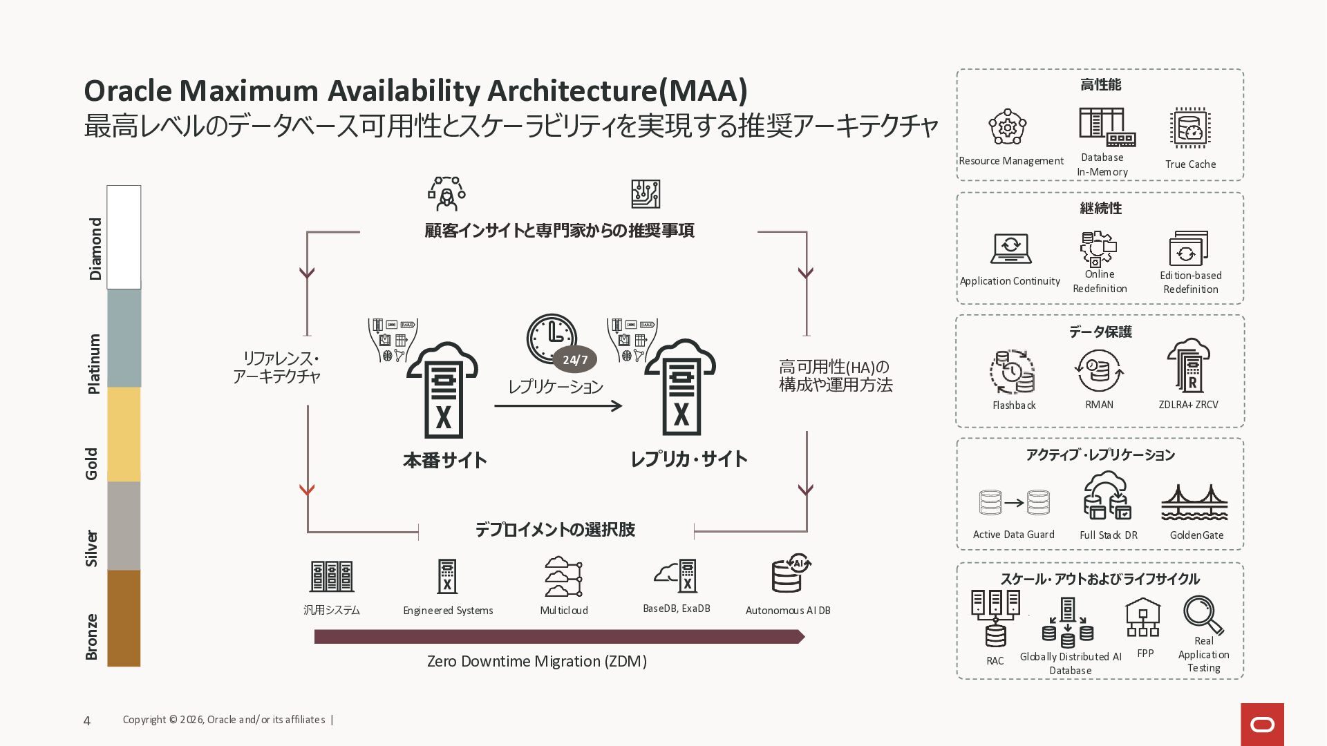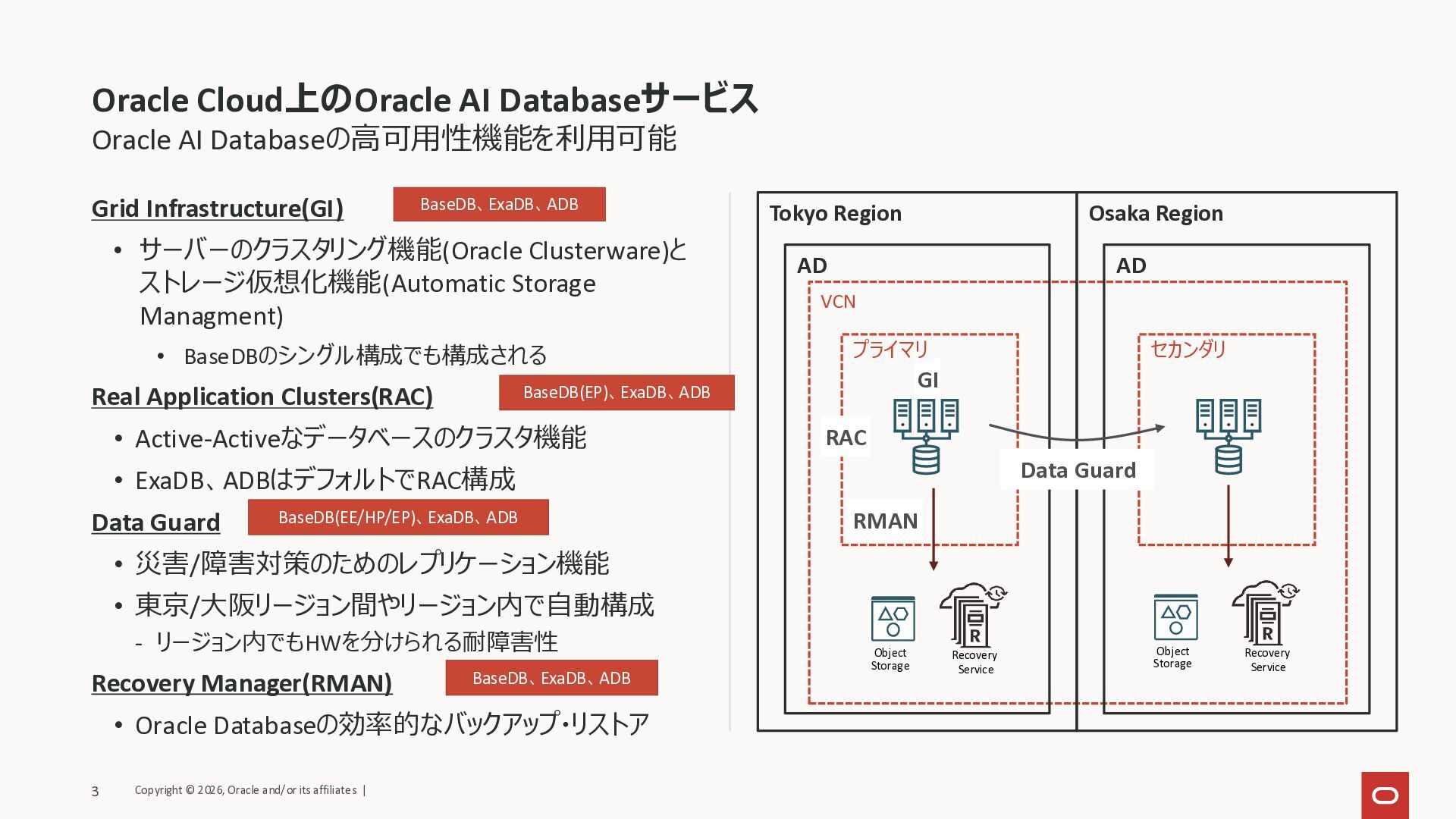 Storage Managment) • BaseDBのシングル構成でも構成される Real Application Clusters(RAC) • Active-Activeなデータベースのクラスタ機能 • ExaDB、ADBはデフォルトでRAC構成 Data Guard • 災害/障害対策のためのレプリケーション機能 • 東京/大阪リージョン間やリージョン内で自動構成 - リージョン内でもHWを分けられる耐障害性 Recovery Manager(RMAN) • Oracle Databaseの効率的なバックアップ・リストア 3 Copyright © 2026, Oracle and/or its affiliates | Oracle AI Databaseの高可用性機能を利用可能 BaseDB、ExaDB、ADB BaseDB(EP)、ExaDB、ADB VCN AD AD Tokyo Region Osaka Region プライマリ RAC セカンダリ Data Guard BaseDB(EE/HP/EP)、ExaDB、ADB BaseDB、ExaDB、ADB Recovery Service Recovery Service Object Storage Object Storage GI RMAN