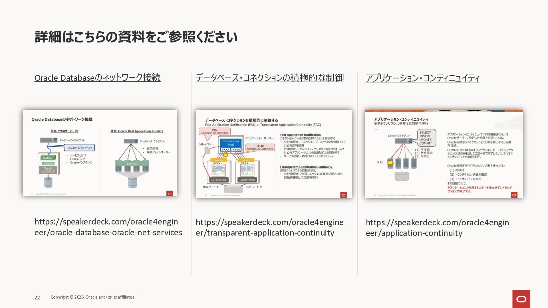 まで自動で行う。 アプリケーションから見るとエラーを検出せずにトランザ クションが完了する。 Oracle製コネクション・プールからコネクションを取り出 してCOMMITしたら返却するコードならコード改修は (ほぼ)不要。 (Transparent) Application Continuity (透過的)アプリケーション・コンティニュイティ (1) 再接続 (2) 状態確認 (3) 再実行 Oracleクライアント RAC SELECT INSERT UPDATE COMMIT Copyright © 2026, Oracle and/or its affiliates | 21