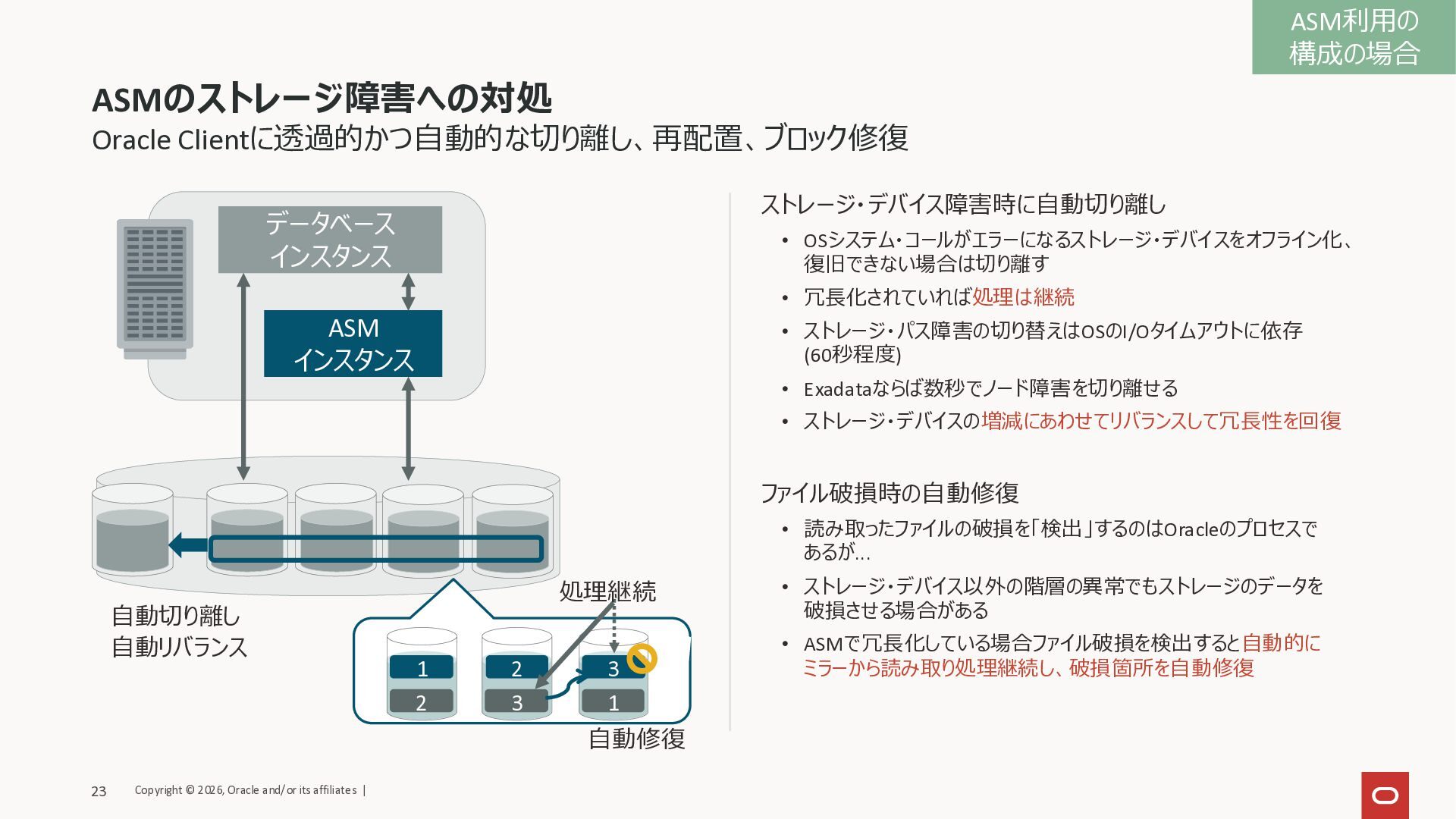 • Exadataならば数秒でノード障害を切り離せる • ストレージ・デバイスの増減にあわせてリバランスして冗長性を回復 ファイル破損時の自動修復 • 読み取ったファイルの破損を「検出」するのはOracleのプロセスで あるが... • ストレージ・デバイス以外の階層の異常でもストレージのデータを 破損させる場合がある • ASMで冗長化している場合ファイル破損を検出すると自動的に ミラーから読み取り処理継続し、破損箇所を自動修復 Oracle Clientに透過的かつ自動的な切り離し、再配置、ブロック修復 データベース インスタンス ASM インスタンス 1 2 3 2 3 1 自動切り離し 処理継続 自動修復 自動リバランス ASM利用の 構成の場合 Copyright © 2026, Oracle and/or its affiliates | 23