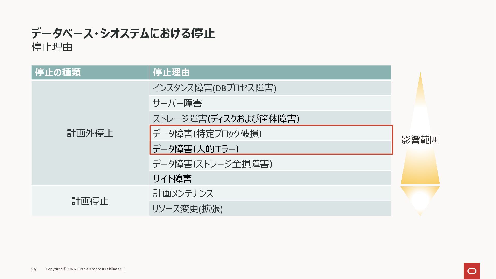サイト障害 計画停止 計画メンテナンス リソース変更(拡張) データベース・シオステムにおける停止 影響範囲 Copyright © 2026, Oracle and/or its affiliates | 25