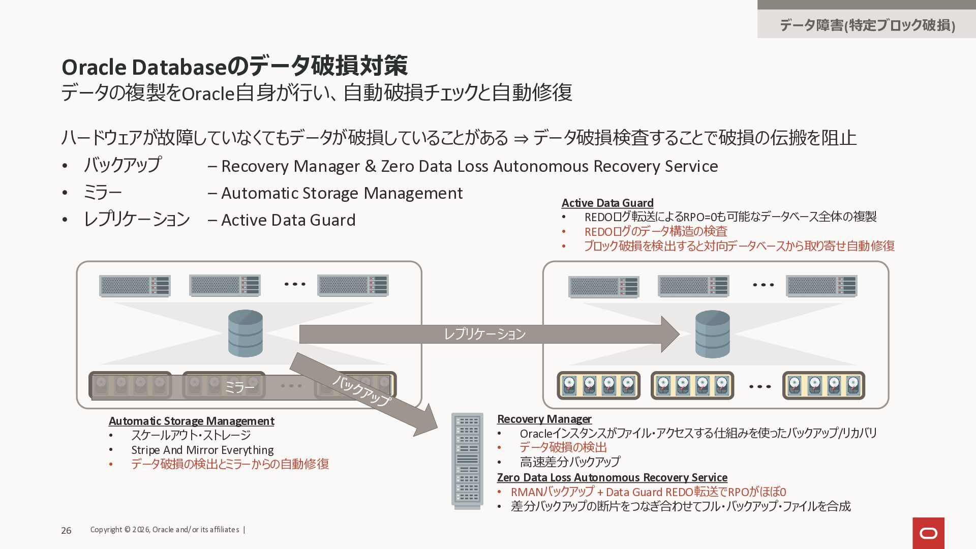 Recovery Manager & Zero Data Loss Autonomous Recovery Service • ミラー – Automatic Storage Management • レプリケーション – Active Data Guard レプリケーション Automatic Storage Management • スケールアウト・ストレージ • Stripe And Mirror Everything • データ破損の検出とミラーからの自動修復 Active Data Guard • REDOログ転送によるRPO=0も可能なデータベース全体の複製 • REDOログのデータ構造の検査 • ブロック破損を検出すると対向データベースから取り寄せ自動修復 Recovery Manager • Oracleインスタンスがファイル・アクセスする仕組みを使ったバックアップ/リカバリ • データ破損の検出 • 高速差分バックアップ Zero Data Loss Autonomous Recovery Service • RMANバックアップ + Data Guard REDO転送でRPOがほぼ0 • 差分バックアップの断片をつなぎ合わせてフル・バックアップ・ファイルを合成 ミラー Copyright © 2026, Oracle and/or its affiliates | 26