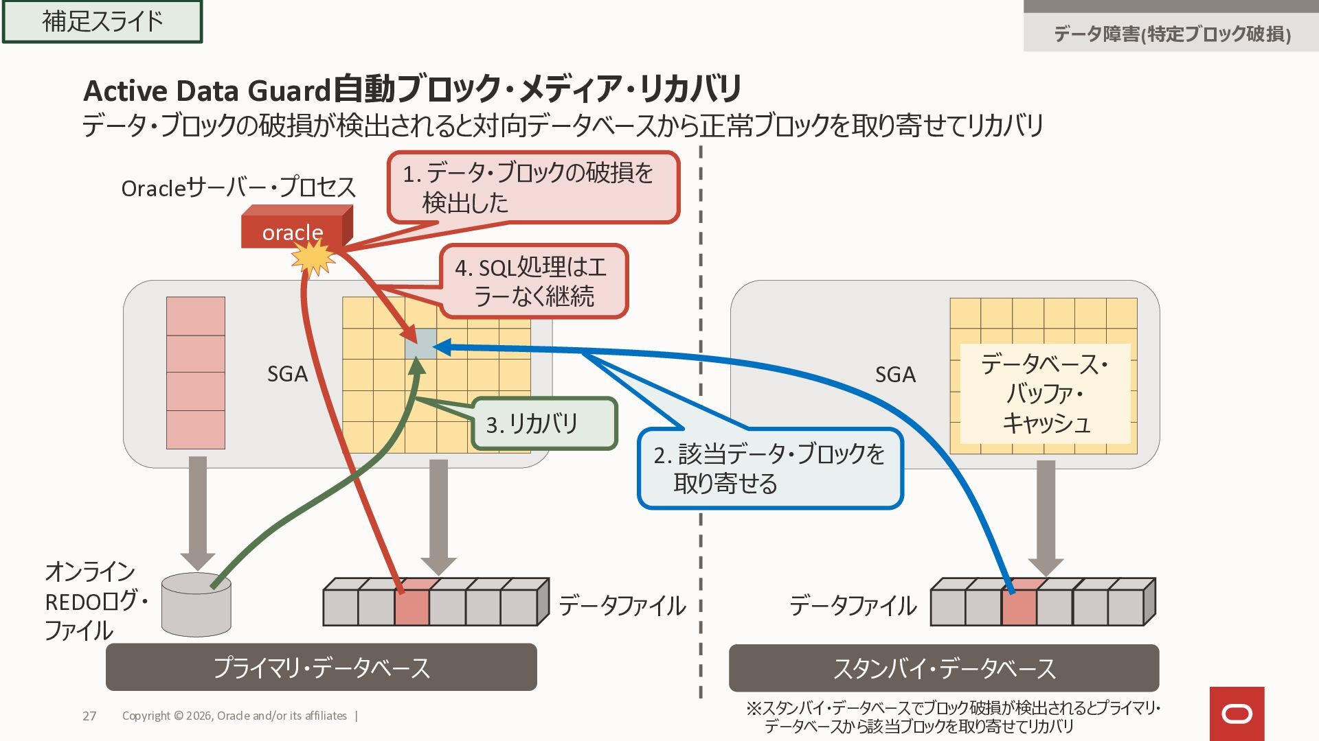 SGA 1. データ・ブロックの破損を 検出した データベース・ バッファ・ キャッシュ データファイル SGA プライマリ・データベース スタンバイ・データベース 2. 該当データ・ブロックを 取り寄せる 3. リカバリ 4. SQL処理はエ ラーなく継続 ※スタンバイ・データベースでブロック破損が検出されるとプライマリ・ データベースから該当ブロックを取り寄せてリカバリ Copyright © 2026, Oracle and/or its affiliates | 27 補足スライド データ障害(特定ブロック破損)