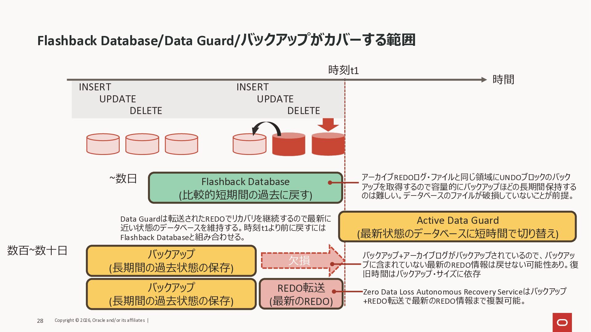 INSERT UPDATE DELETE 欠損 Active Data Guard (最新状態のデータベースに短時間で切り替え) Flashback Database (比較的短期間の過去に戻す) ~数日 数百~数十日 バックアップ (長期間の過去状態の保存) REDO転送 (最新のREDO) バックアップ+アーカイブログがバックアップされているので、バックアッ プに含まれていない最新のREDO情報は戻せない可能性あり。復 旧時間はバックアップ・サイズに依存 Zero Data Loss Autonomous Recovery Serviceはバックアップ +REDO転送で最新のREDO情報まで複製可能。 アーカイブREDOログ・ファイルと同じ領域にUNDOブロックのバック アップを取得するので容量的にバックアップほどの長期間保持する のは難しい。データベースのファイルが破損していないことが前提。 Data Guardは転送されたREDOでリカバリを継続するので最新に 近い状態のデータベースを維持する。時刻t1より前に戻すには Flashback Databaseと組み合わせる。 Copyright © 2026, Oracle and/or its affiliates | 28