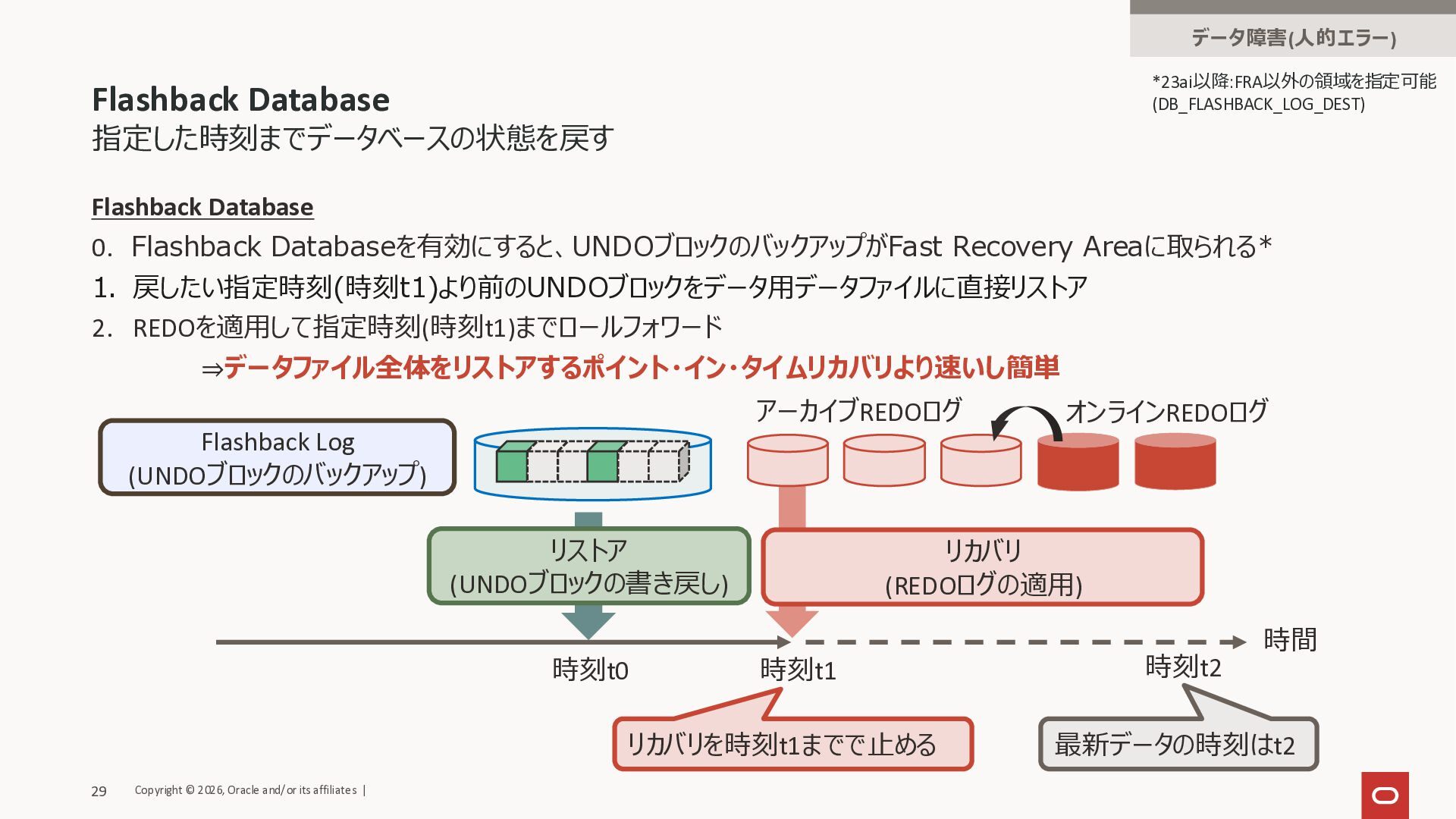 23. 指定した時刻までデータベースの状態を戻す Flashback Database データ障害(人的エラー) *23ai以降:FRA以外の領域を指定可能 (DB_FLASHBACK_LOG_DEST) Flashback Database 0. Flashback