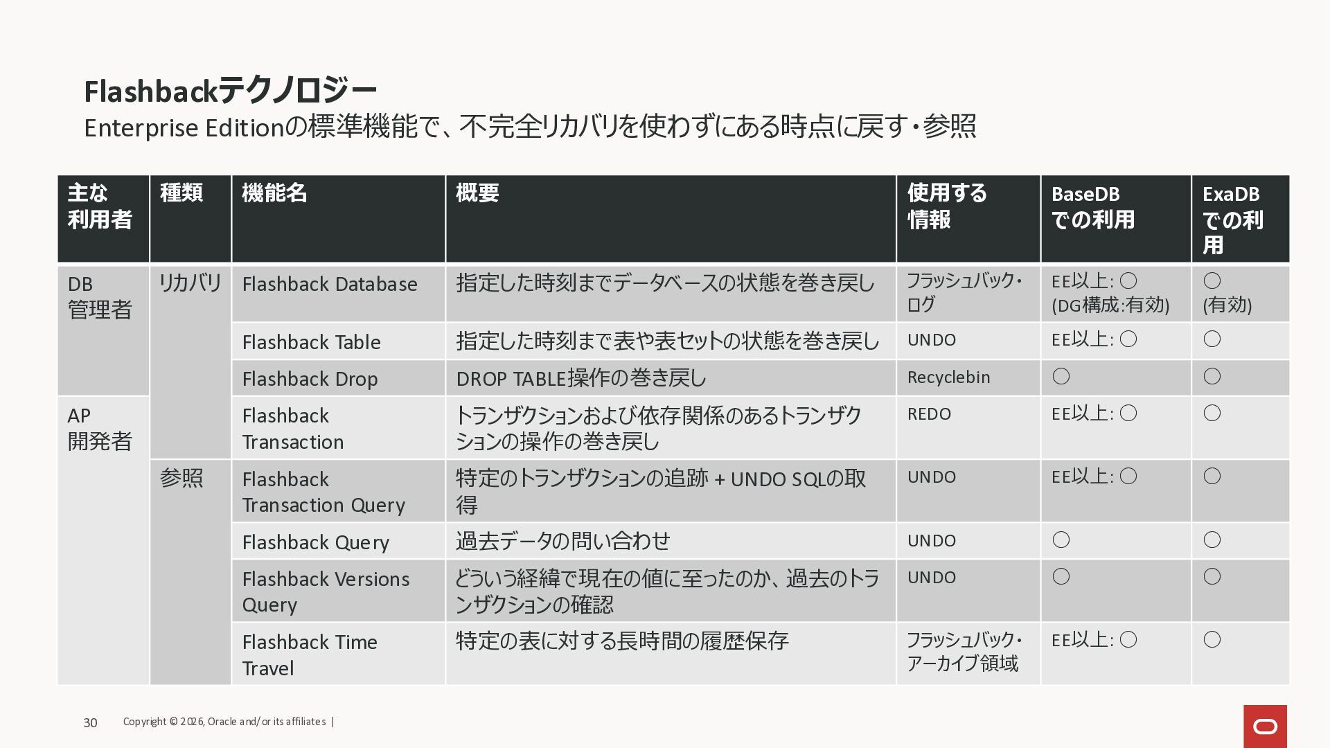 での利用 ExaDB での利 用 DB 管理者 リカバリ Flashback Database 指定した時刻までデータベースの状態を巻き戻し フラッシュバック・ ログ EE以上: ◯ (DG構成:有効) ◯ (有効) Flashback Table 指定した時刻まで表や表セットの状態を巻き戻し UNDO EE以上: ◯ ◯ Flashback Drop DROP TABLE操作の巻き戻し Recyclebin ◯ ◯ AP 開発者 Flashback Transaction トランザクションおよび依存関係のあるトランザク ションの操作の巻き戻し REDO EE以上: ◯ ◯ 参照 Flashback Transaction Query 特定のトランザクションの追跡 + UNDO SQLの取 得 UNDO EE以上: ◯ ◯ Flashback Query 過去データの問い合わせ UNDO ◯ ◯ Flashback Versions Query どういう経緯で現在の値に至ったのか、過去のトラ ンザクションの確認 UNDO ◯ ◯ Flashback Time Travel 特定の表に対する長時間の履歴保存 フラッシュバック・ アーカイブ領域 EE以上: ◯ ◯ Flashbackテクノロジー Copyright © 2026, Oracle and/or its affiliates | 30