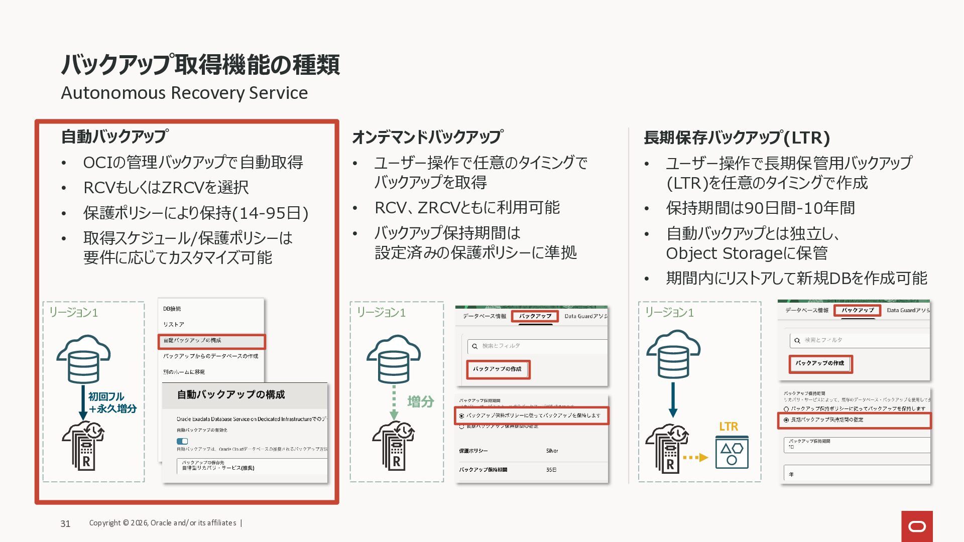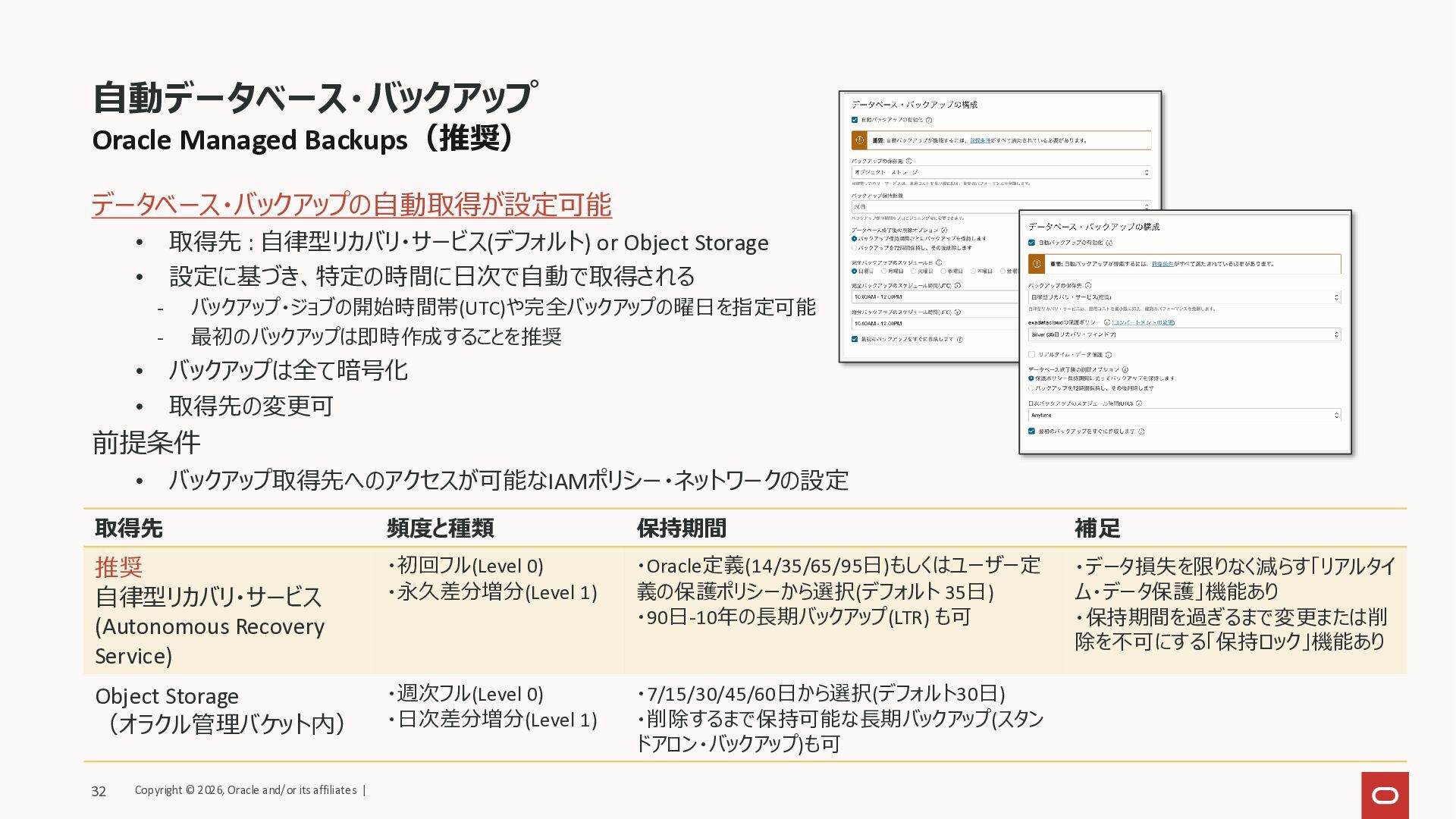保護ポリシーにより保持(14-95日) • 取得スケジュール/保護ポリシーは 要件に応じてカスタマイズ可能 オンデマンドバックアップ • ユーザー操作で任意のタイミングで バックアップを取得 • RCV、ZRCVともに利用可能 • バックアップ保持期間は 設定済みの保護ポリシーに準拠 長期保存バックアップ(LTR) • ユーザー操作で長期保管用バックアップ (LTR)を任意のタイミングで作成 • 保持期間は90日間-10年間 • 自動バックアップとは独立し、 Object Storageに保管 • 期間内にリストアして新規DBを作成可能 リージョン1 リージョン1 リージョン1 増分 初回フル +永久増分 LTR Copyright © 2026, Oracle and/or its affiliates | 31