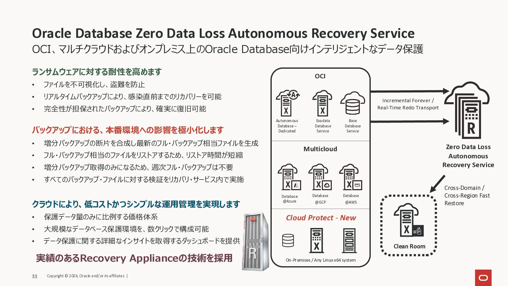ファイルを不可視化し、盗難を防止 • リアルタイムバックアップにより、感染直前までのリカバリーを可能 • 完全性が担保されたバックアップにより、確実に復旧可能 バックアップにおける、本番環境への影響を極小化します • 増分バックアップの断片を合成し最新のフル・バックアップ相当ファイルを生成 • フル・バックアップ相当のファイルをリストアするため、リストア時間が短縮 • 増分バックアップ取得のみになるため、週次フル・バックアップは不要 • すべてのバックアップ・ファイルに対する検証をリカバリ・サービス内で実施 クラウドにより、低コストかつシンプルな運用管理を実現します • 保護データ量のみに比例する価格体系 • 大規模なデータベース保護環境を、数クリックで構成可能 • データ保護に関する詳細なインサイトを取得するダッシュボードを提供 OCI、マルチクラウドおよびオンプレミス上のOracle Database向けインテリジェントなデータ保護 実績のあるRecovery Applianceの技術を採用 Database @Azure Autonomous Database – Dedicated Zero Data Loss Autonomous Recovery Service Database @GCP Multicloud OCI Database @AWS Exadata Database Service Base Database Service Incremental Forever / Real-Time Redo Transport Cross-Domain / Cross-Region Fast Restore Clean Room Cloud Protect - New On-Premises / Any Linux x64 system Copyright © 2026, Oracle and/or its affiliates | 33