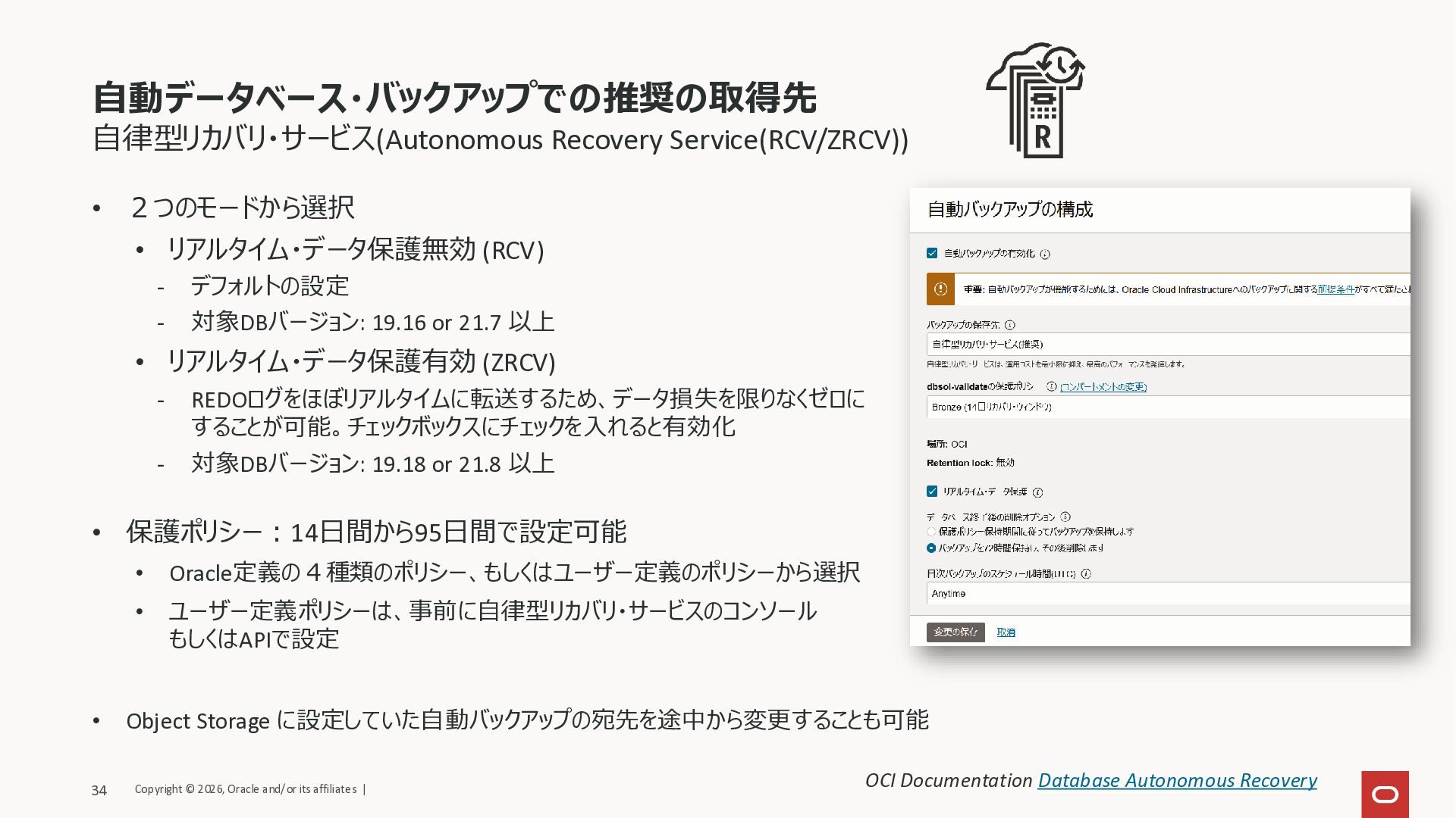 - 対象DBバージョン: 19.16 or 21.7 以上 • リアルタイム・データ保護有効 (ZRCV) - REDOログをほぼリアルタイムに転送するため、データ損失を限りなくゼロに することが可能。チェックボックスにチェックを入れると有効化 - 対象DBバージョン: 19.18 or 21.8 以上 • 保護ポリシー:14日間から95日間で設定可能 • Oracle定義の4種類のポリシー、もしくはユーザー定義のポリシーから選択 • ユーザー定義ポリシーは、事前に自律型リカバリ・サービスのコンソール もしくはAPIで設定 • Object Storage に設定していた自動バックアップの宛先を途中から変更することも可能 自動データベース・バックアップでの推奨の取得先 OCI Documentation Database Autonomous Recovery Copyright © 2026, Oracle and/or its affiliates | 34