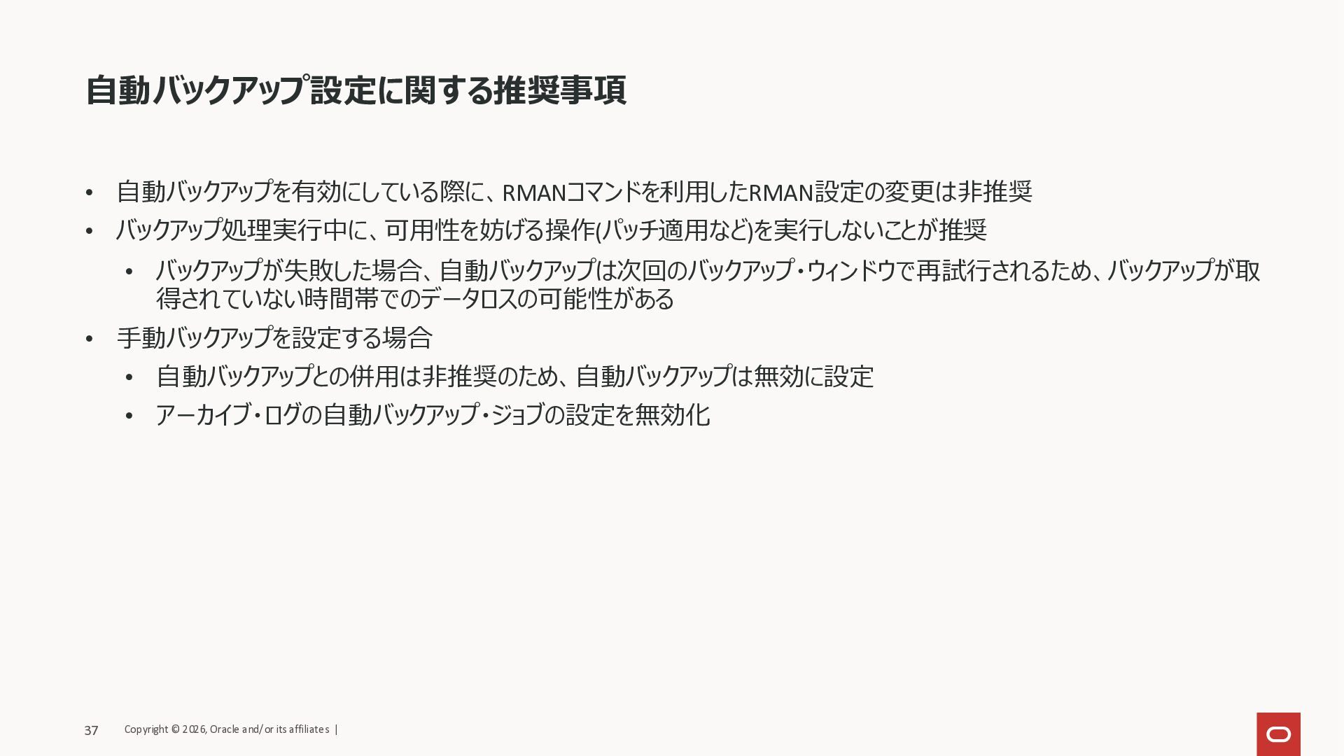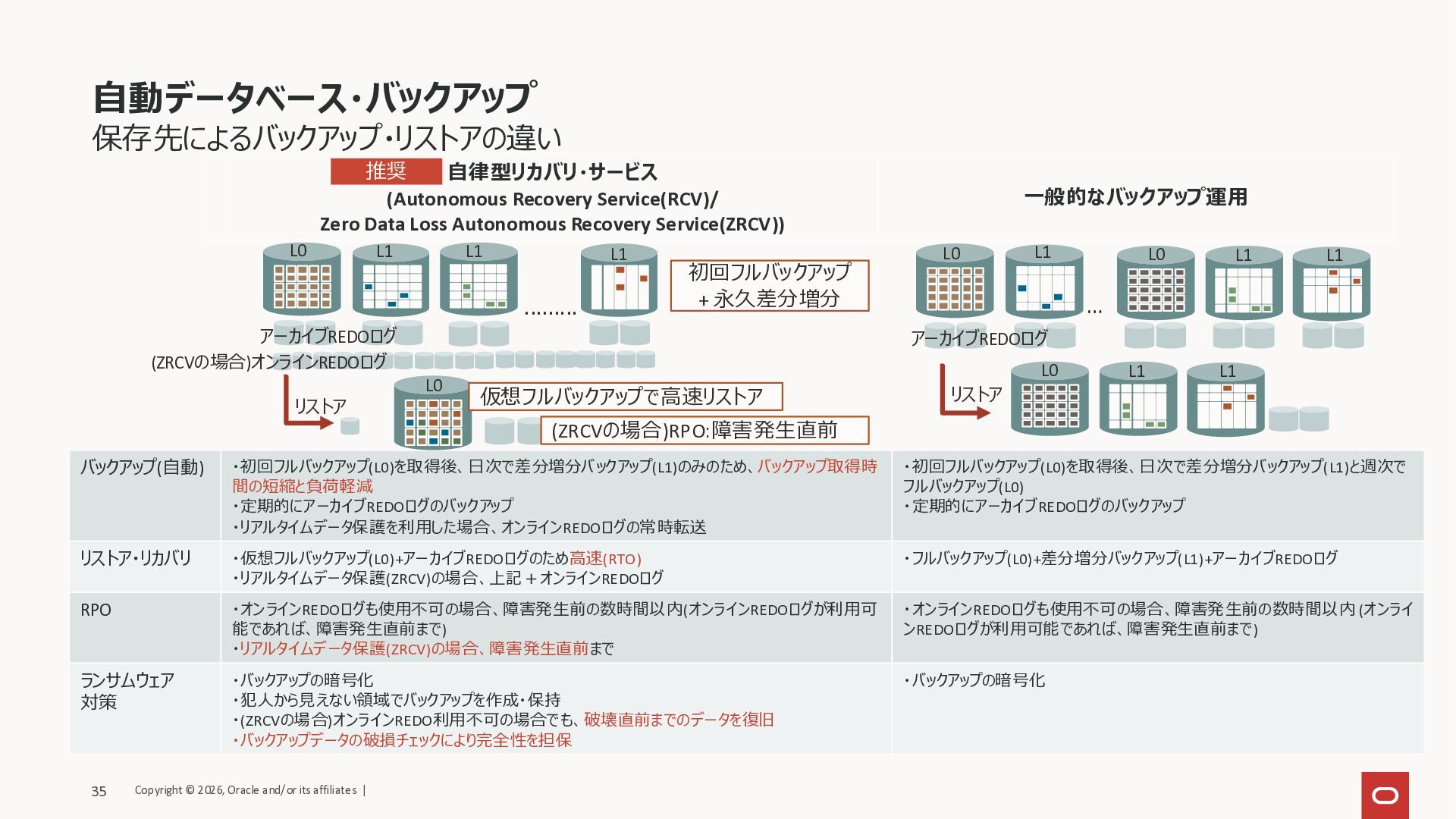 リストア・リカバリ ・仮想フルバックアップ(L0)+アーカイブREDOログのため高速(RTO) ・リアルタイムデータ保護(ZRCV)の場合、上記+オンラインREDOログ ・フルバックアップ(L0)+差分増分バックアップ(L1)+アーカイブREDOログ RPO ・オンラインREDOログも使用不可の場合、障害発生前の数時間以内(オンラインREDOログが利用可 能であれば、障害発生直前まで) ・リアルタイムデータ保護(ZRCV)の場合、障害発生直前まで ・オンラインREDOログも使用不可の場合、障害発生前の数時間以内 (オンライ ンREDOログが利用可能であれば、障害発生直前まで) ランサムウェア 対策 ・バックアップの暗号化 ・犯人から見えない領域でバックアップを作成・保持 ・(ZRCVの場合)オンラインREDO利用不可の場合でも、破壊直前までのデータを復旧 ・バックアップデータの破損チェックにより完全性を担保 ・バックアップの暗号化 自律型リカバリ・サービス (Autonomous Recovery Service(RCV)/ Zero Data Loss Autonomous Recovery Service(ZRCV)) 一般的なバックアップ運用 … リストア L0 L0 L1 L1 L1 L0 L1 L1 アーカイブREDOログ ......... リストア 仮想フルバックアップで高速リストア 初回フルバックアップ + 永久差分増分 L0 アーカイブREDOログ (ZRCVの場合)オンラインREDOログ (ZRCVの場合)RPO:障害発生直前 L0 L1 L1 L1 推奨 Copyright © 2026, Oracle and/or its affiliates | 35