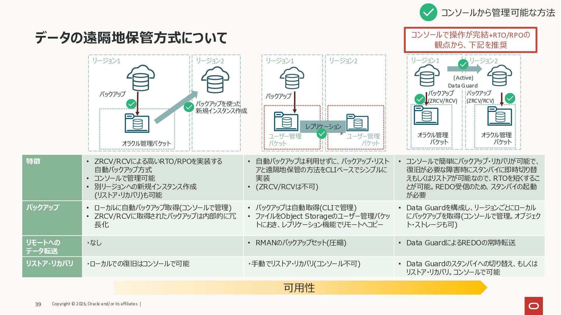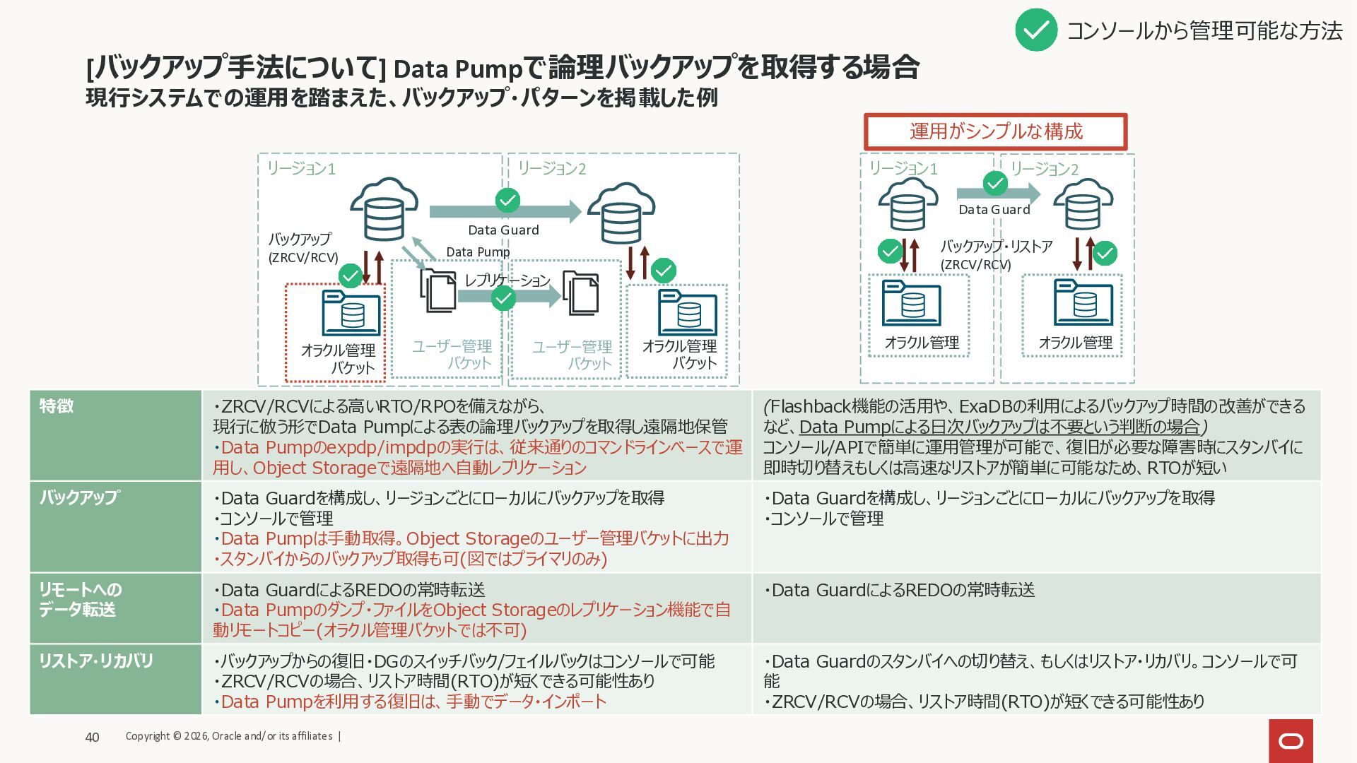 (Active) Data Guard バックアップ (ZRCV/RCV) バックアップ (ZRCV/RCV) コンソールから管理可能な方法 バックアップ 特徴 • ZRCV/RCVによる高いRTO/RPOを実装する 自動バックアップ方式 • コンソールで管理可能 • 別リージョンへの新規インスタンス作成 (リストア・リカバリ)も可能 • 自動バックアップは利用せずに、バックアップ・リスト アと遠隔地保管の方法をCLIベースでシンプルに 実装 • (ZRCV/RCVは不可) • コンソールで簡単にバックアップ・リカバリが可能で、 復旧が必要な障害時にスタンバイに即時切り替 えもしくはリストアが可能なので、RTOを短くするこ とが可能。REDO受信のため、スタンバイの起動 が必要 バックアップ • ローカルに自動バックアップ取得(コンソールで管理) • ZRCV/RCVに取得されたバックアップは内部的に冗 長化 • バックアップは自動取得(CLIで管理) • ファイルをObject Storageのユーザー管理バケッ トにおき、レプリケーション機能でリモートへコピー • Data Guardを構成し、リージョンごとにローカル にバックアップを取得(コンソールで管理。オブジェク ト・ストレージも可) リモートへの データ転送 ・なし • RMANのバックアップセット(圧縮) • Data GuardによるREDOの常時転送 リストア・リカバリ ・ローカルでの復旧はコンソールで可能 ・手動でリストア・リカバリ(コンソール不可) • Data Guardのスタンバイへの切り替え、もしくは リストア・リカバリ。コンソールで可能 ユーザー管理 バケット レプリケーション バックアップを使った 新規インスタンス作成 オラクル管理バケット オラクル管理 バケット オラクル管理 バケット コンソールで操作が完結+RTO/RPOの 観点から、下記を推奨 Copyright © 2026, Oracle and/or its affiliates | 39 可用性