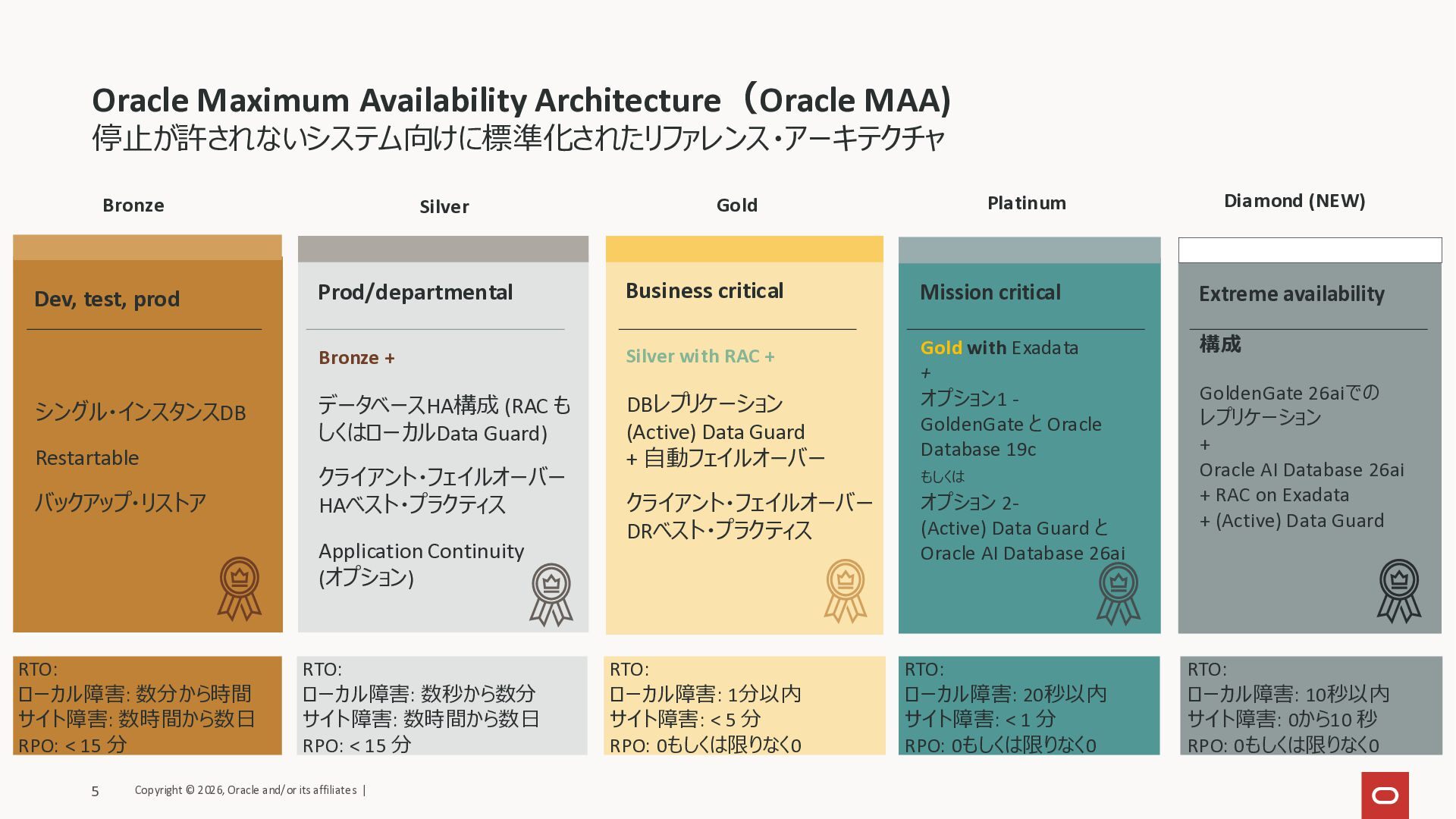 顧客インサイトと専門家からの推奨事項 本番サイト レプリカ・サイト レプリケーション 24/7 Zero Downtime Migration (ZDM) Bronze Silver Gold Platinum 継続性 Application Continuity Edition-based Redefinition Online Redefinition アクティブ・レプリケーション データ保護 Flashback ZDLRA+ ZRCV RMAN 高性能 True Cache Resource Management Database In-Memory スケール・アウトおよびライフサイクル RAC Globally Distributed AI Database FPP Real Application Testing Active Data Guard GoldenGate Full Stack DR 汎用システム Autonomous AI DB BaseDB, ExaDB Engineered Systems Multicloud Diamond Copyright © 2026, Oracle and/or its affiliates | 4