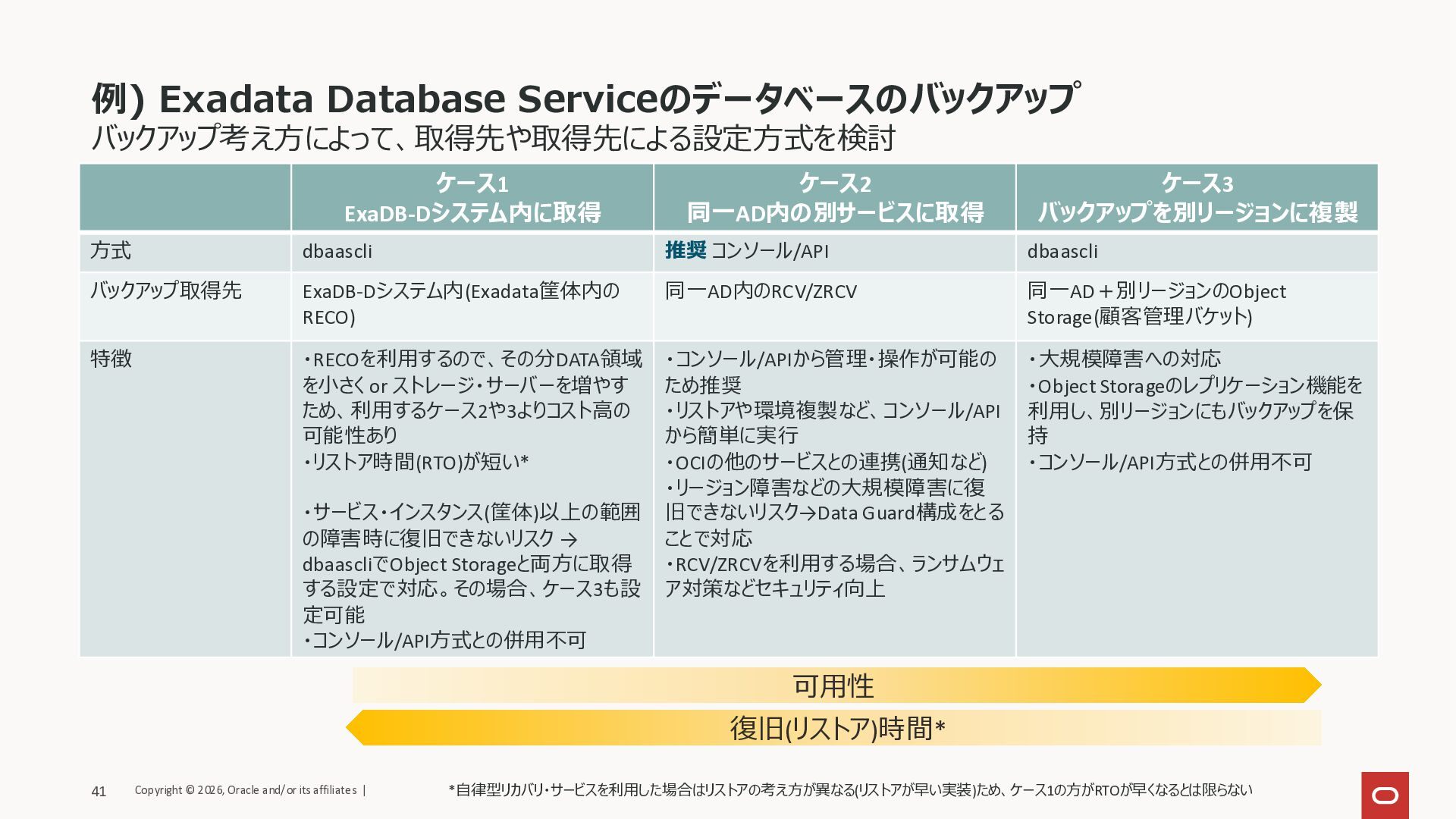 バックアップを別リージョンに複製 方式 dbaascli 推奨 コンソール/API dbaascli バックアップ取得先 ExaDB-Dシステム内(Exadata筐体内の RECO) 同一AD内のRCV/ZRCV 同一AD+別リージョンのObject Storage(顧客管理バケット) 特徴 ・RECOを利用するので、その分DATA領域 を小さく or ストレージ・サーバーを増やす ため、利用するケース2や3よりコスト高の 可能性あり ・リストア時間(RTO)が短い* ・サービス・インスタンス(筐体)以上の範囲 の障害時に復旧できないリスク → dbaascliでObject Storageと両方に取得 する設定で対応。その場合、ケース3も設 定可能 ・コンソール/API方式との併用不可 ・コンソール/APIから管理・操作が可能の ため推奨 ・リストアや環境複製など、コンソール/API から簡単に実行 ・OCIの他のサービスとの連携(通知など) ・リージョン障害などの大規模障害に復 旧できないリスク→Data Guard構成をとる ことで対応 ・RCV/ZRCVを利用する場合、ランサムウェ ア対策などセキュリティ向上 ・大規模障害への対応 ・Object Storageのレプリケーション機能を 利用し、別リージョンにもバックアップを保 持 ・コンソール/API方式との併用不可 *自律型リカバリ・サービスを利用した場合はリストアの考え方が異なる(リストアが早い実装)ため、ケース1の方がRTOが早くなるとは限らない 可用性 復旧(リストア)時間* Copyright © 2026, Oracle and/or its affiliates | 41
