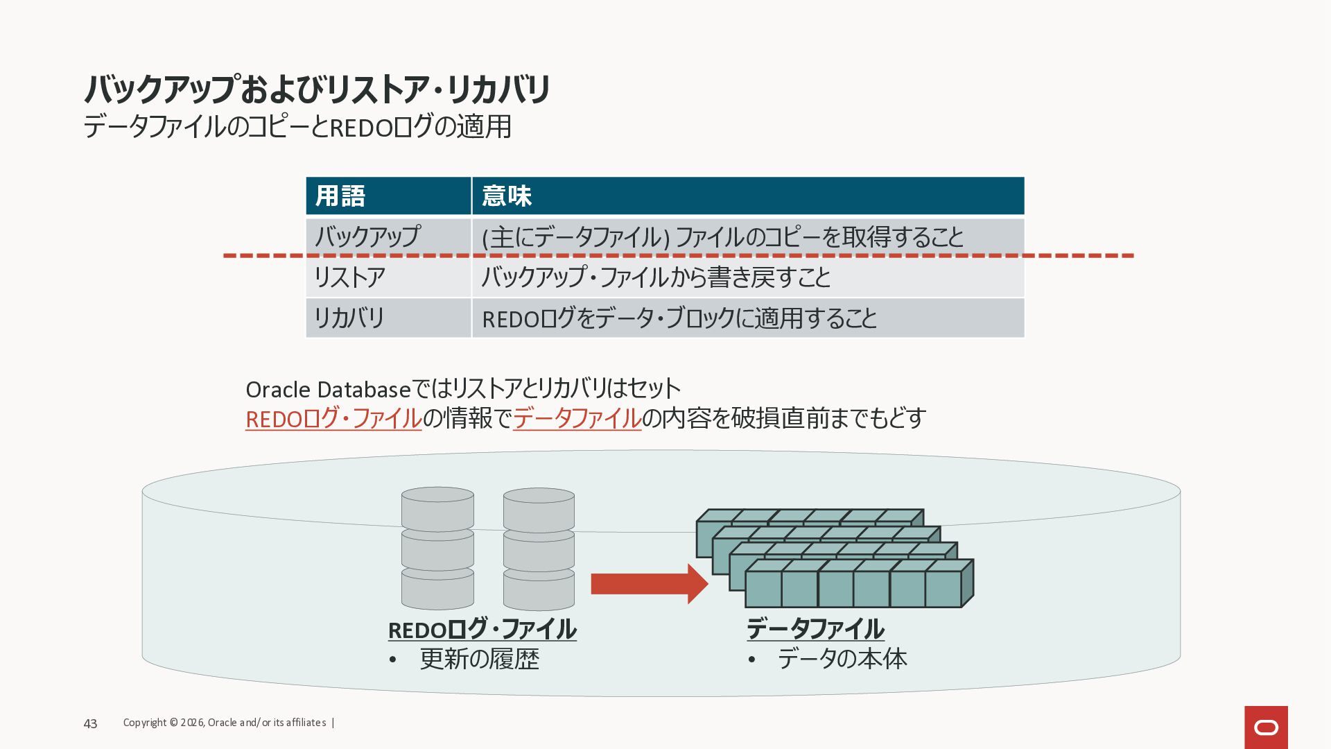 バックアップ (主にデータファイル) ファイルのコピーを取得すること リストア バックアップ・ファイルから書き戻すこと リカバリ REDOログをデータ・ブロックに適用すること Oracle Databaseではリストアとリカバリはセット REDOログ・ファイルの情報でデータファイルの内容を破損直前までもどす Copyright © 2026, Oracle and/or its affiliates | 43
