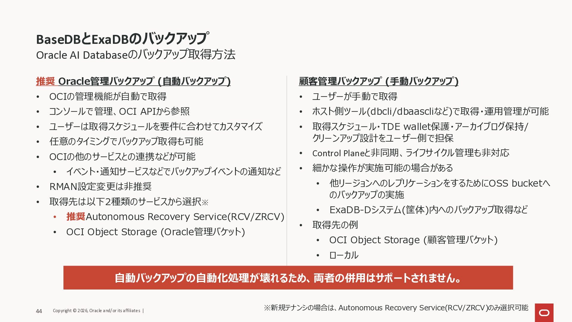 ユーザーは取得スケジュールを要件に合わせてカスタマイズ • 任意のタイミングでバックアップ取得も可能 • OCIの他のサービスとの連携などが可能 • イベント・通知サービスなどでバックアップイベントの通知など • RMAN設定変更は非推奨 • 取得先は以下2種類のサービスから選択※ • 推奨Autonomous Recovery Service(RCV/ZRCV) • OCI Object Storage (Oracle管理バケット) 顧客管理バックアップ (手動バックアップ) • ユーザーが手動で取得 • ホスト側ツール(dbcli/dbaascliなど)で取得・運用管理が可能 • 取得スケジュール・TDE wallet保護・アーカイブログ保持/ クリーンアップ設計をユーザー側で担保 • Control Planeと非同期、ライフサイクル管理も非対応 • 細かな操作が実施可能の場合がある • 他リージョンへのレプリケーションをするためにOSS bucketへ のバックアップの実施 • ExaDB-Dシステム(筐体)内へのバックアップ取得など • 取得先の例 • OCI Object Storage (顧客管理バケット) • ローカル Oracle AI Databaseのバックアップ取得方法 自動バックアップの自動化処理が壊れるため、両者の併用はサポートされません。 ※新規テナンシの場合は、Autonomous Recovery Service(RCV/ZRCV)のみ選択可能 Copyright © 2026, Oracle and/or its affiliates | 44