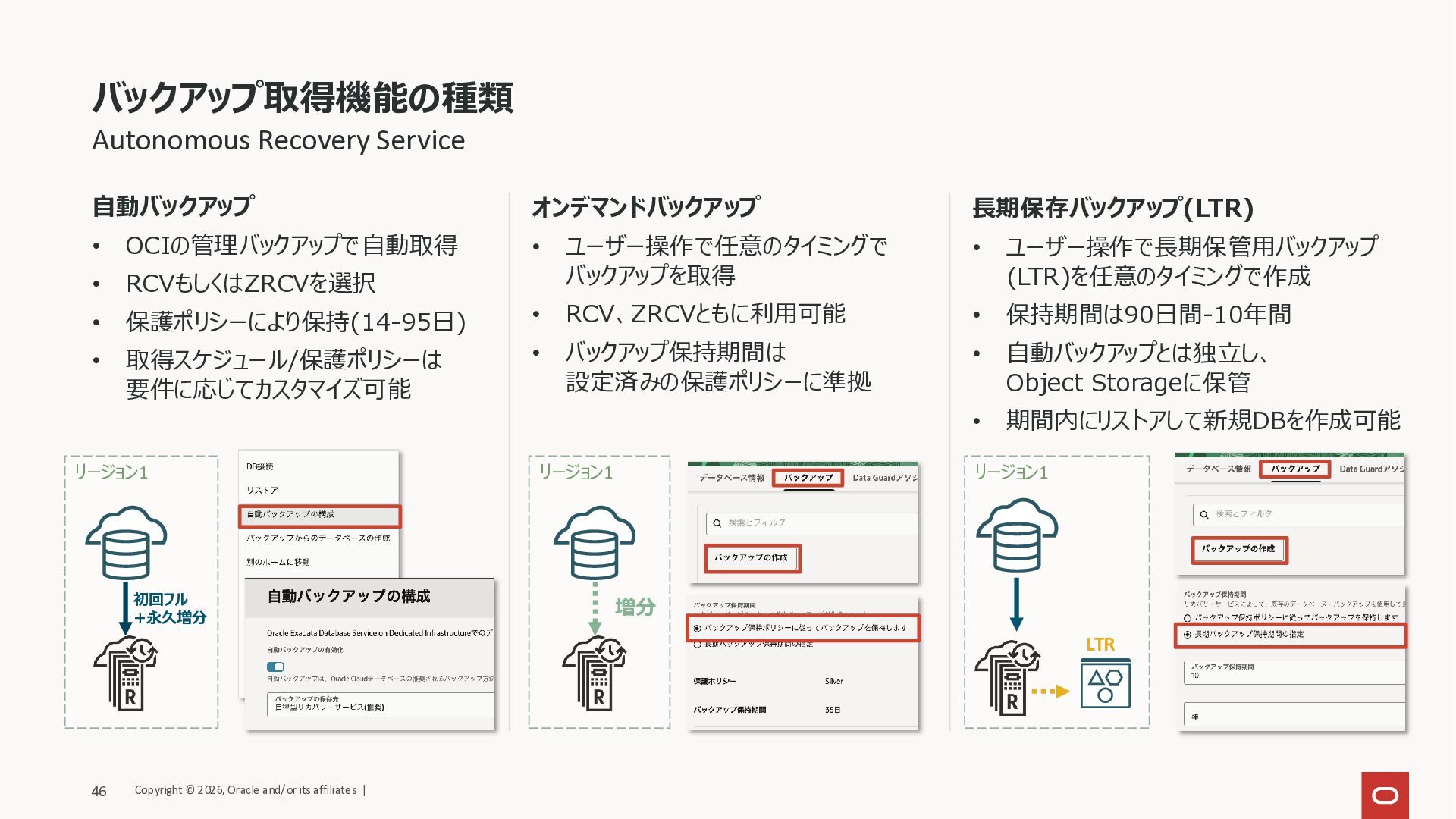 ユーザーは取得スケジュールを要件に合わせてカスタマイズ • 任意のタイミングでバックアップ取得も可能 • OCIの他のサービスとの連携などが可能 • イベント・通知サービスなどでバックアップイベントの通知など • RMAN設定変更は非推奨 • 取得先は以下2種類のサービスから選択※ • 推奨Autonomous Recovery Service(RCV/ZRCV) • OCI Object Storage (Oracle管理バケット) 顧客管理バックアップ (手動バックアップ) • ユーザーが手動で取得 • ホスト側ツール(dbcli/dbaascliなど)で取得・運用管理が可能 • 取得スケジュール・TDE wallet保護・アーカイブログ保持/ クリーンアップ設計をユーザー側で担保 • Control Planeと非同期、ライフサイクル管理も非対応 • 細かな操作が実施可能の場合がある • 他リージョンへのレプリケーションをするためにOSS bucketへ のバックアップの実施 • ExaDB-Dシステム(筐体)内へのバックアップ取得など • 取得先の例 • OCI Object Storage (顧客管理バケット) • ローカル Oracle AI Databaseのバックアップ取得方法 自動バックアップの自動化処理が壊れるため、両者の併用はサポートされません。 ※新規テナンシの場合は、Autonomous Recovery Service(RCV/ZRCV)のみ選択可能 以降は、Oracle推奨のバックアップ先であるRCV/ZRCVに絞り、 機能・運用方法を解説しています。 Copyright © 2026, Oracle and/or its affiliates | 45