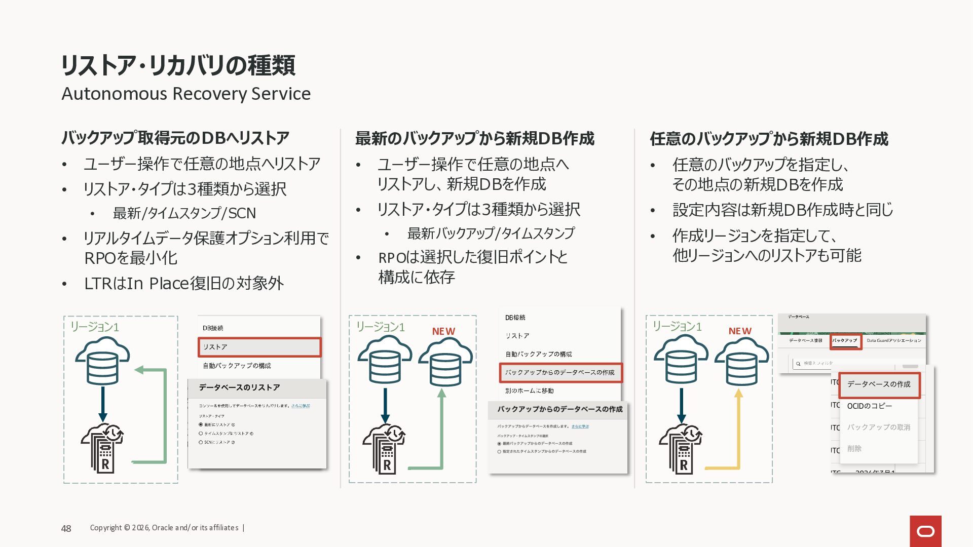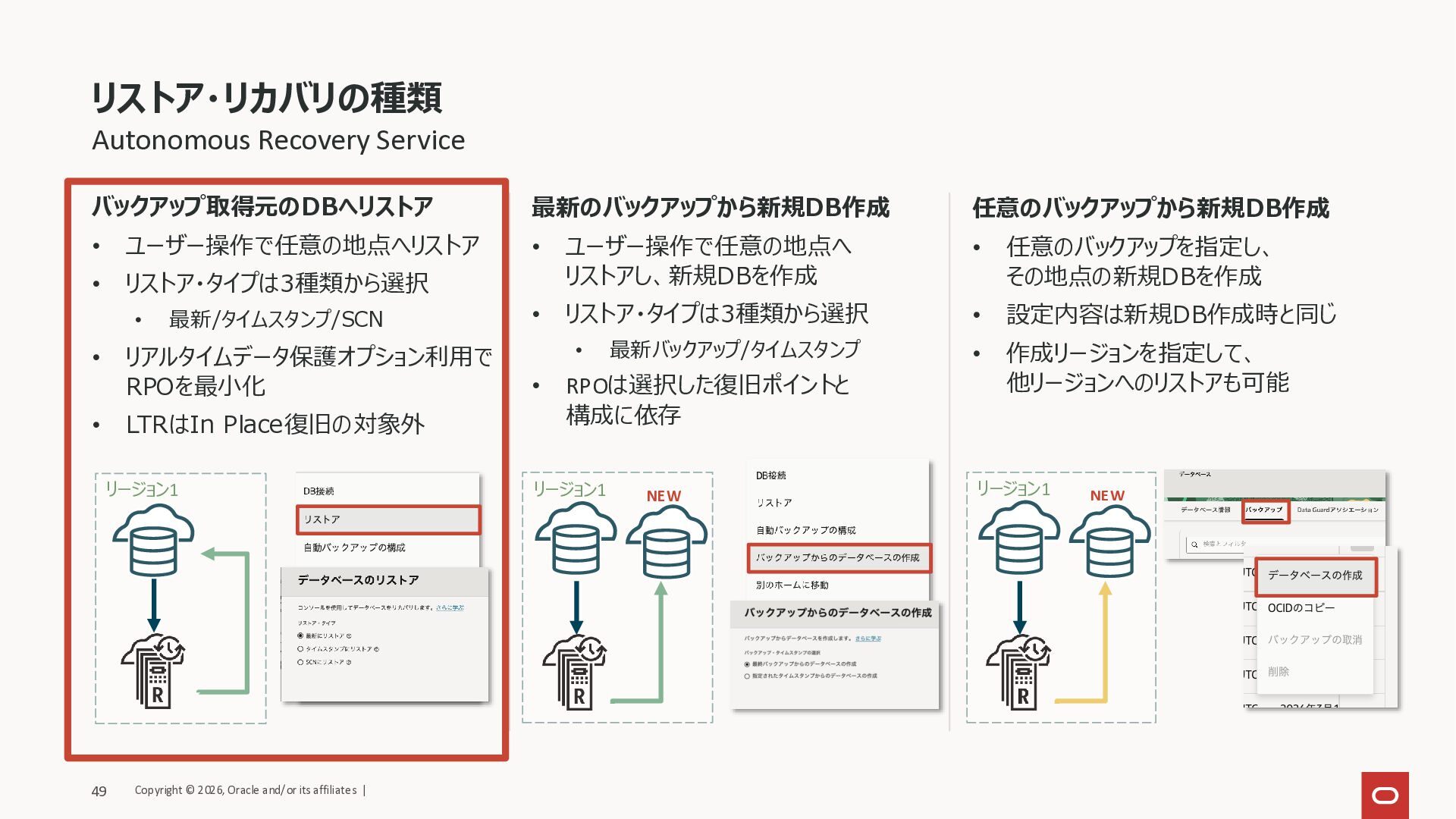 最新/タイムスタンプ/SCN • リアルタイムデータ保護オプション利用で RPOを最小化 • LTRはIn Place復旧の対象外 最新のバックアップから新規DB作成 • ユーザー操作で任意の地点へ リストアし、新規DBを作成 • リストア・タイプは3種類から選択 • 最新バックアップ/タイムスタンプ • RPOは選択した復旧ポイントと 構成に依存 任意のバックアップから新規DB作成 • 任意のバックアップを指定し、 その地点の新規DBを作成 • 設定内容は新規DB作成時と同じ • 作成リージョンを指定して、 他リージョンへのリストアも可能 リージョン1 NEW リージョン1 リージョン1 NEW Copyright © 2026, Oracle and/or its affiliates | 48