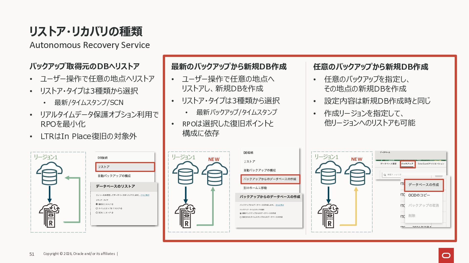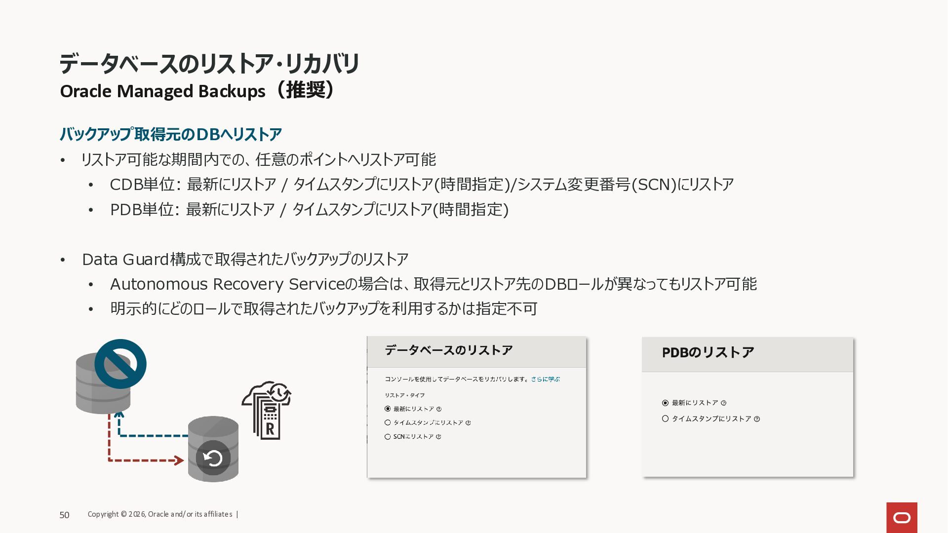 タイムスタンプにリストア(時間指定)/システム変更番号(SCN)にリストア • PDB単位: 最新にリストア / タイムスタンプにリストア(時間指定) • Data Guard構成で取得されたバックアップのリストア • Autonomous Recovery Serviceの場合は、取得元とリストア先のDBロールが異なってもリストア可能 • 明示的にどのロールで取得されたバックアップを利用するかは指定不可 データベースのリストア・リカバリ Copyright © 2026, Oracle and/or its affiliates | 50