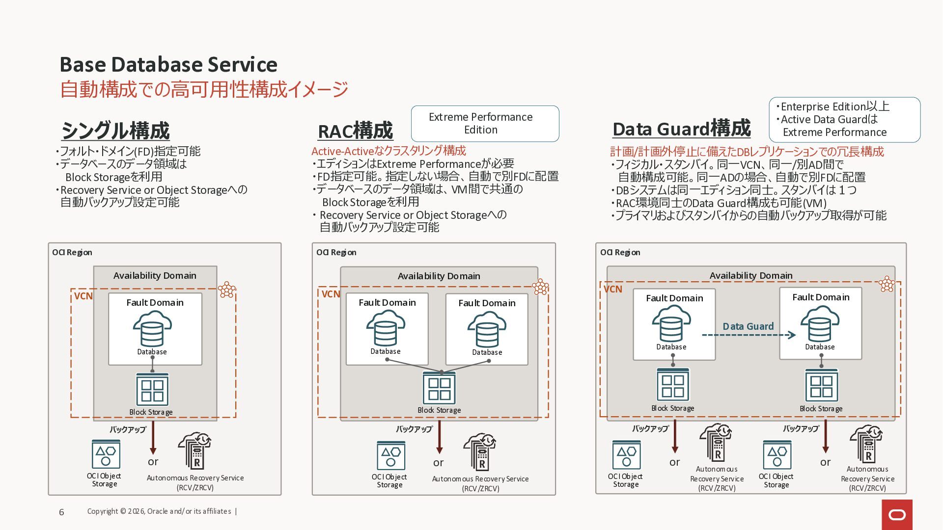 Availability Domain Fault Domain Fault Domain OCI Region Availability Domain Fault Domain 自動構成での高可用性構成イメージ Base Database Service シングル構成 ・フォルト・ドメイン(FD)指定可能 ・データベースのデータ領域は Block Storageを利用 ・Recovery Service or Object Storageへの 自動バックアップ設定可能 Data Guard RAC構成 Active-Activeなクラスタリング構成 ・エディションはExtreme Performanceが必要 ・FD指定可能。指定しない場合、自動で別FDに配置 ・データベースのデータ領域は、VM間で共通の Block Storageを利用 ・ Recovery Service or Object Storageへの 自動バックアップ設定可能 Extreme Performance Edition Data Guard構成 計画/計画外停止に備えたDBレプリケーションでの冗長構成 ・フィジカル・スタンバイ。同一VCN、同一/別AD間で 自動構成可能。同一ADの場合、自動で別FDに配置 ・DBシステムは同一エディション同士。スタンバイは1つ ・RAC環境同士のData Guard構成も可能(VM) ・プライマリおよびスタンバイからの自動バックアップ取得が可能 ・Enterprise Edition以上 ・Active Data Guardは Extreme Performance Block Storage Block Storage Block Storage Block Storage Database Database Database Database Database VCN VCN VCN バックアップ OCI Object Storage or Copyright © 2026, Oracle and/or its affiliates | 6 Autonomous Recovery Service (RCV/ZRCV) OCI Object Storage or Autonomous Recovery Service (RCV/ZRCV) バックアップ OCI Object Storage or Autonomous Recovery Service (RCV/ZRCV) バックアップ OCI Object Storage or Autonomous Recovery Service (RCV/ZRCV) バックアップ