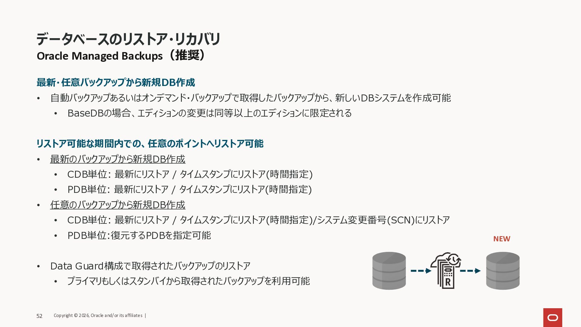 最新/タイムスタンプ/SCN • リアルタイムデータ保護オプション利用で RPOを最小化 • LTRはIn Place復旧の対象外 最新のバックアップから新規DB作成 • ユーザー操作で任意の地点へ リストアし、新規DBを作成 • リストア・タイプは3種類から選択 • 最新バックアップ/タイムスタンプ • RPOは選択した復旧ポイントと 構成に依存 任意のバックアップから新規DB作成 • 任意のバックアップを指定し、 その地点の新規DBを作成 • 設定内容は新規DB作成時と同じ • 作成リージョンを指定して、 他リージョンへのリストアも可能 リージョン1 NEW リージョン1 リージョン1 NEW Copyright © 2026, Oracle and/or its affiliates | 51