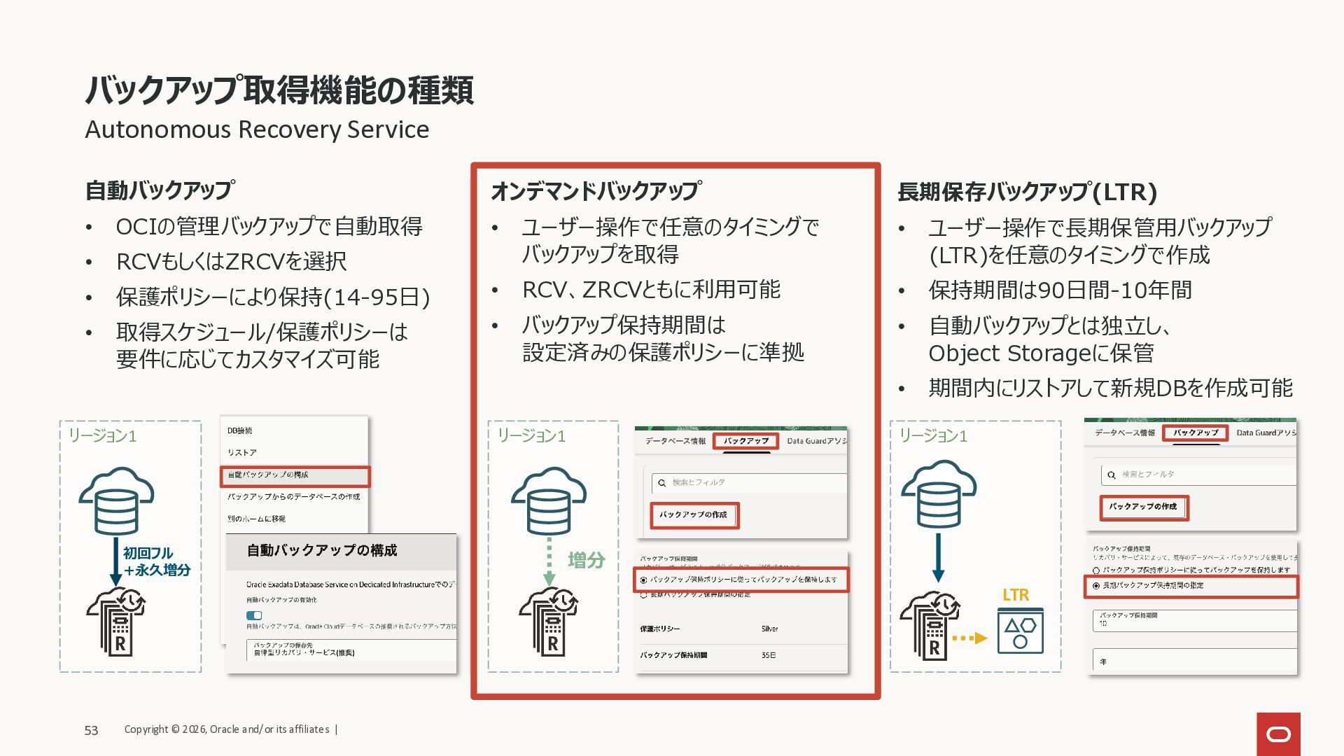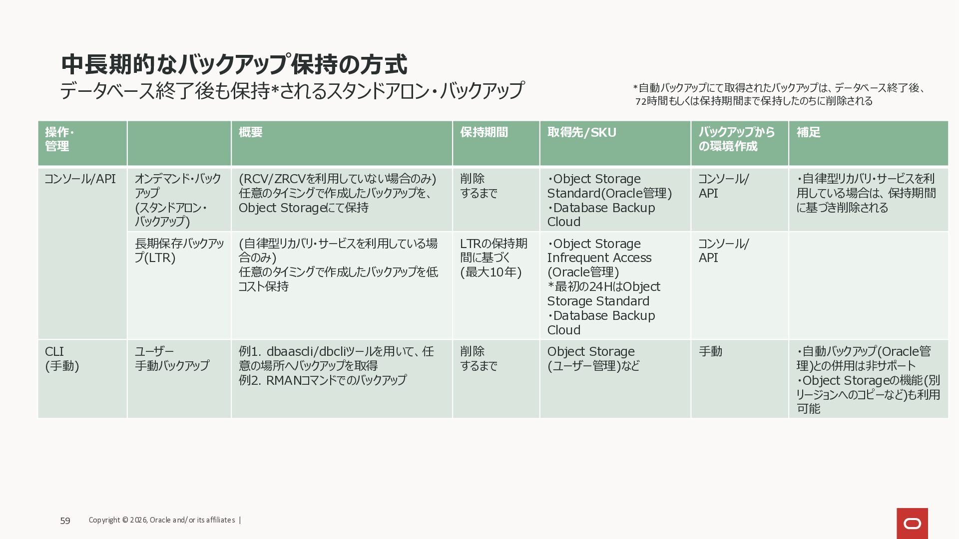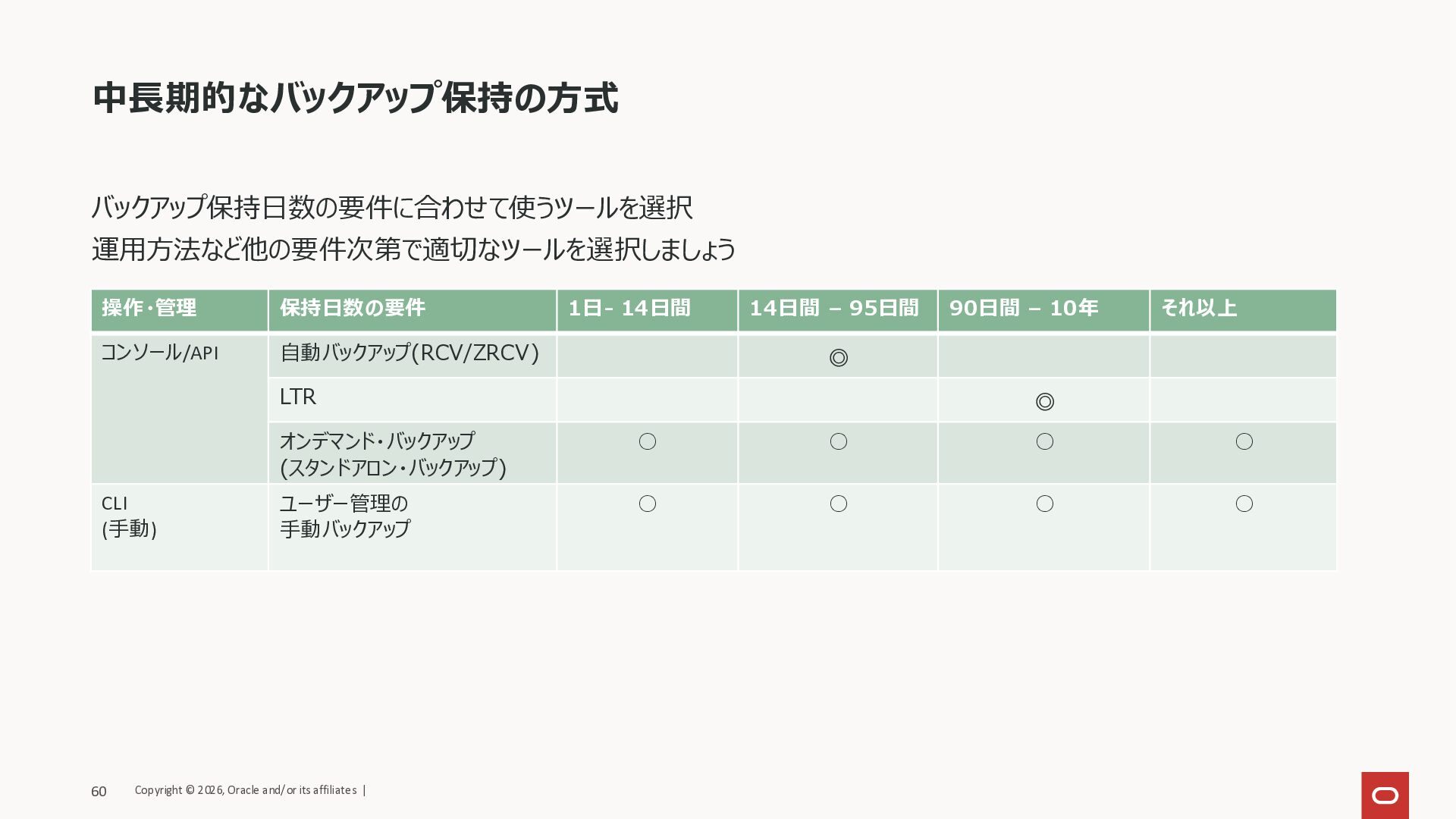 90日間 – 10年 それ以上 コンソール/API 自動バックアップ(RCV/ZRCV) ◎ LTR ◎ オンデマンド・バックアップ (スタンドアロン・バックアップ) ◦ ◦ ◦ ◦ CLI (手動) ユーザー管理の 手動バックアップ ◦ ◦ ◦ ◦ Copyright © 2026, Oracle and/or its affiliates | 60