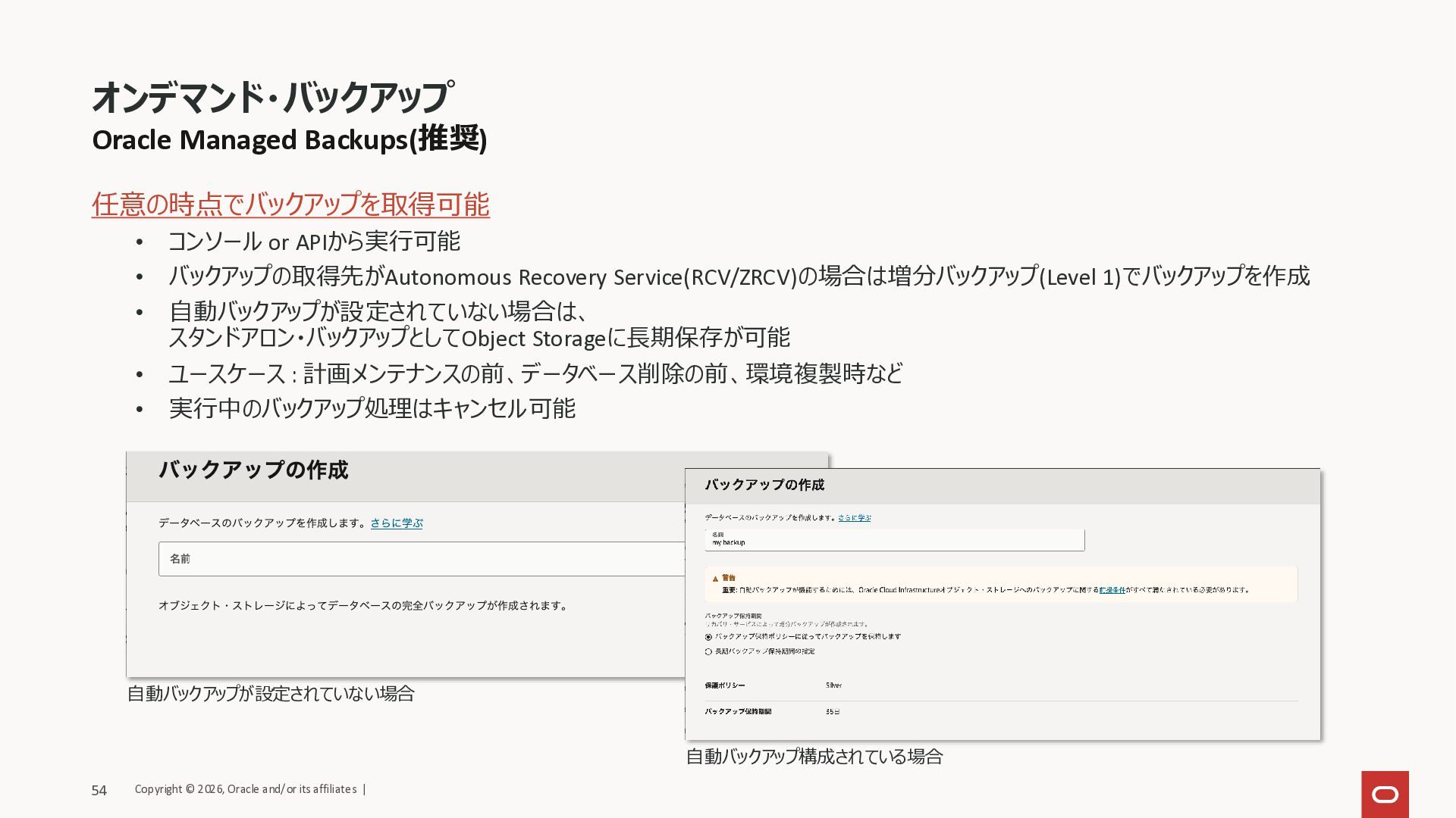 保護ポリシーにより保持(14-95日) • 取得スケジュール/保護ポリシーは 要件に応じてカスタマイズ可能 オンデマンドバックアップ • ユーザー操作で任意のタイミングで バックアップを取得 • RCV、ZRCVともに利用可能 • バックアップ保持期間は 設定済みの保護ポリシーに準拠 長期保存バックアップ(LTR) • ユーザー操作で長期保管用バックアップ (LTR)を任意のタイミングで作成 • 保持期間は90日間-10年間 • 自動バックアップとは独立し、 Object Storageに保管 • 期間内にリストアして新規DBを作成可能 リージョン1 リージョン1 リージョン1 増分 初回フル +永久増分 LTR Copyright © 2026, Oracle and/or its affiliates | 53