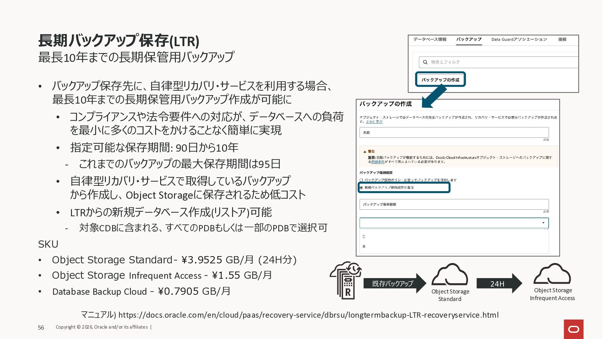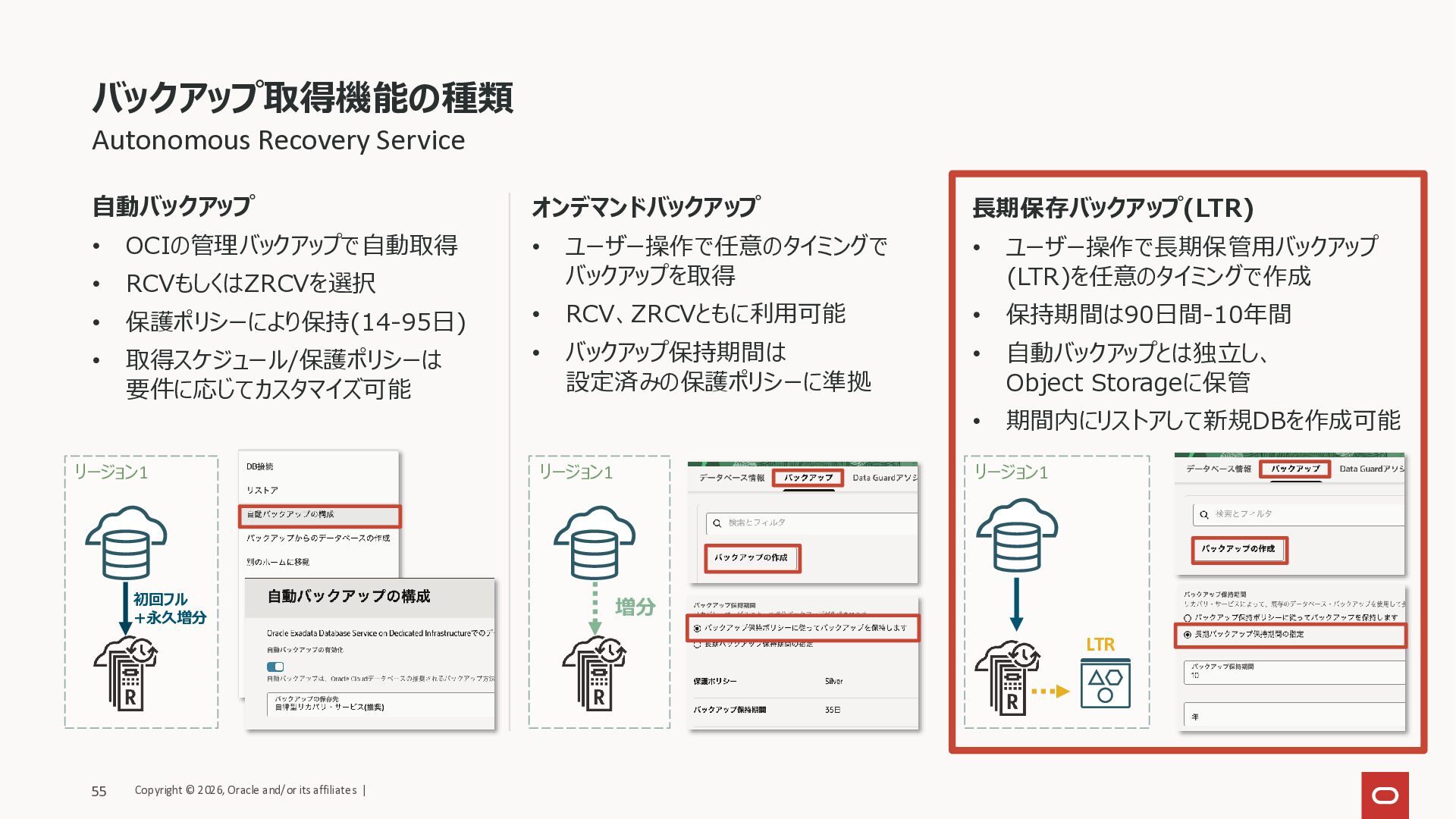 保護ポリシーにより保持(14-95日) • 取得スケジュール/保護ポリシーは 要件に応じてカスタマイズ可能 オンデマンドバックアップ • ユーザー操作で任意のタイミングで バックアップを取得 • RCV、ZRCVともに利用可能 • バックアップ保持期間は 設定済みの保護ポリシーに準拠 長期保存バックアップ(LTR) • ユーザー操作で長期保管用バックアップ (LTR)を任意のタイミングで作成 • 保持期間は90日間-10年間 • 自動バックアップとは独立し、 Object Storageに保管 • 期間内にリストアして新規DBを作成可能 リージョン1 リージョン1 リージョン1 増分 初回フル +永久増分 LTR Copyright © 2026, Oracle and/or its affiliates | 55