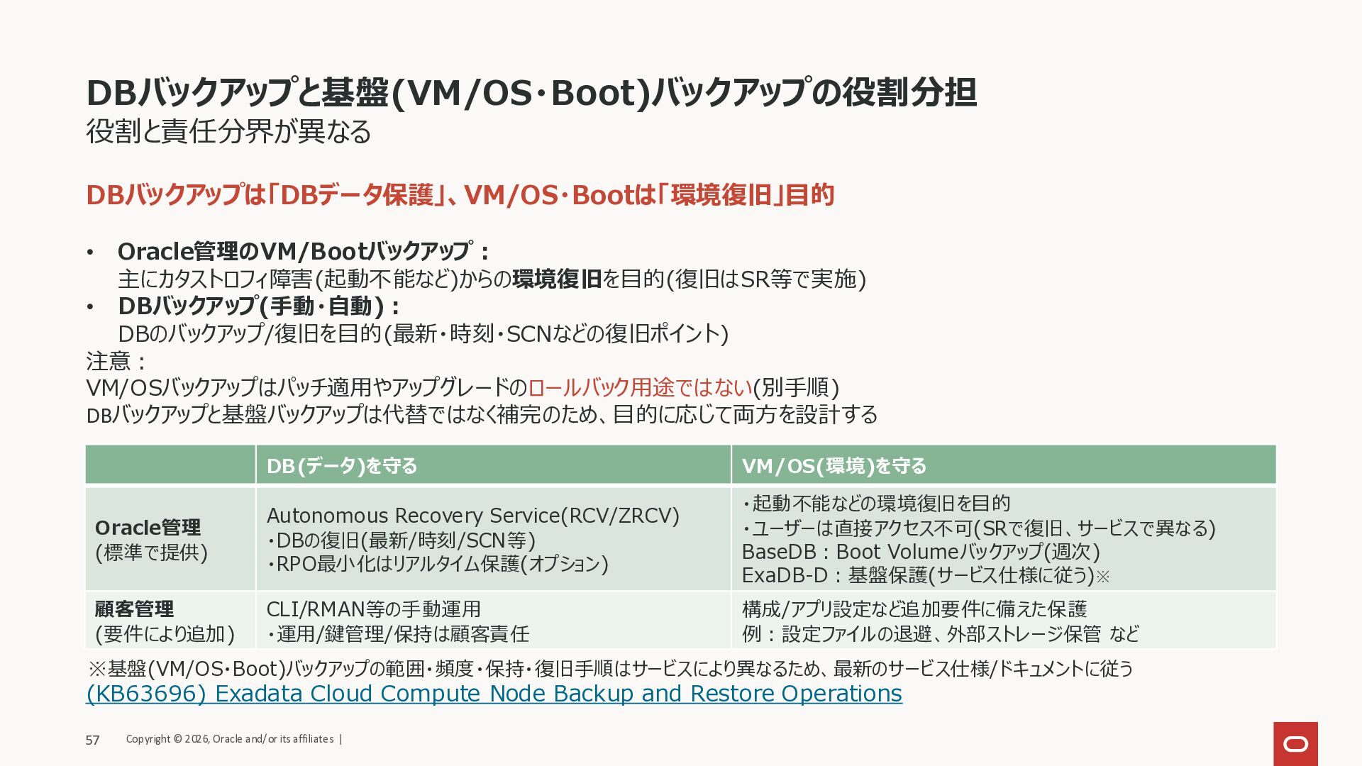DBバックアップと基盤バックアップは代替ではなく補完のため、目的に応じて両方を設計する (KB63696) Exadata Cloud Compute Node Backup and Restore Operations 役割と責任分界が異なる DB(データ)を守る VM/OS(環境)を守る Oracle管理 (標準で提供) Autonomous Recovery Service(RCV/ZRCV) ・DBの復旧(最新/時刻/SCN等) ・RPO最小化はリアルタイム保護(オプション) ・起動不能などの環境復旧を目的 ・ユーザーは直接アクセス不可(SRで復旧、サービスで異なる) BaseDB:Boot Volumeバックアップ(週次) ExaDB-D:基盤保護(サービス仕様に従う)※ 顧客管理 (要件により追加) CLI/RMAN等の手動運用 ・運用/鍵管理/保持は顧客責任 構成/アプリ設定など追加要件に備えた保護 例:設定ファイルの退避、外部ストレージ保管 など ※基盤(VM/OS・Boot)バックアップの範囲・頻度・保持・復旧手順はサービスにより異なるため、最新のサービス仕様/ドキュメントに従う Copyright © 2026, Oracle and/or its affiliates | 57
