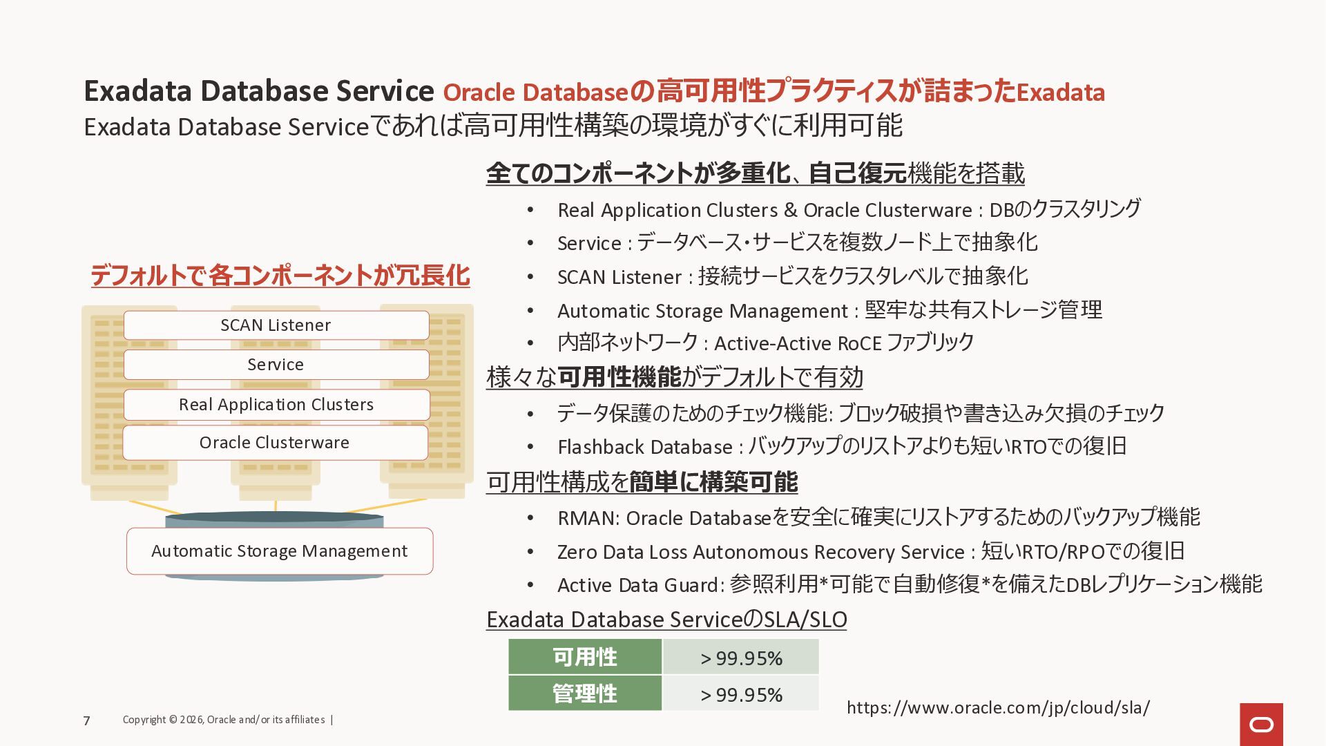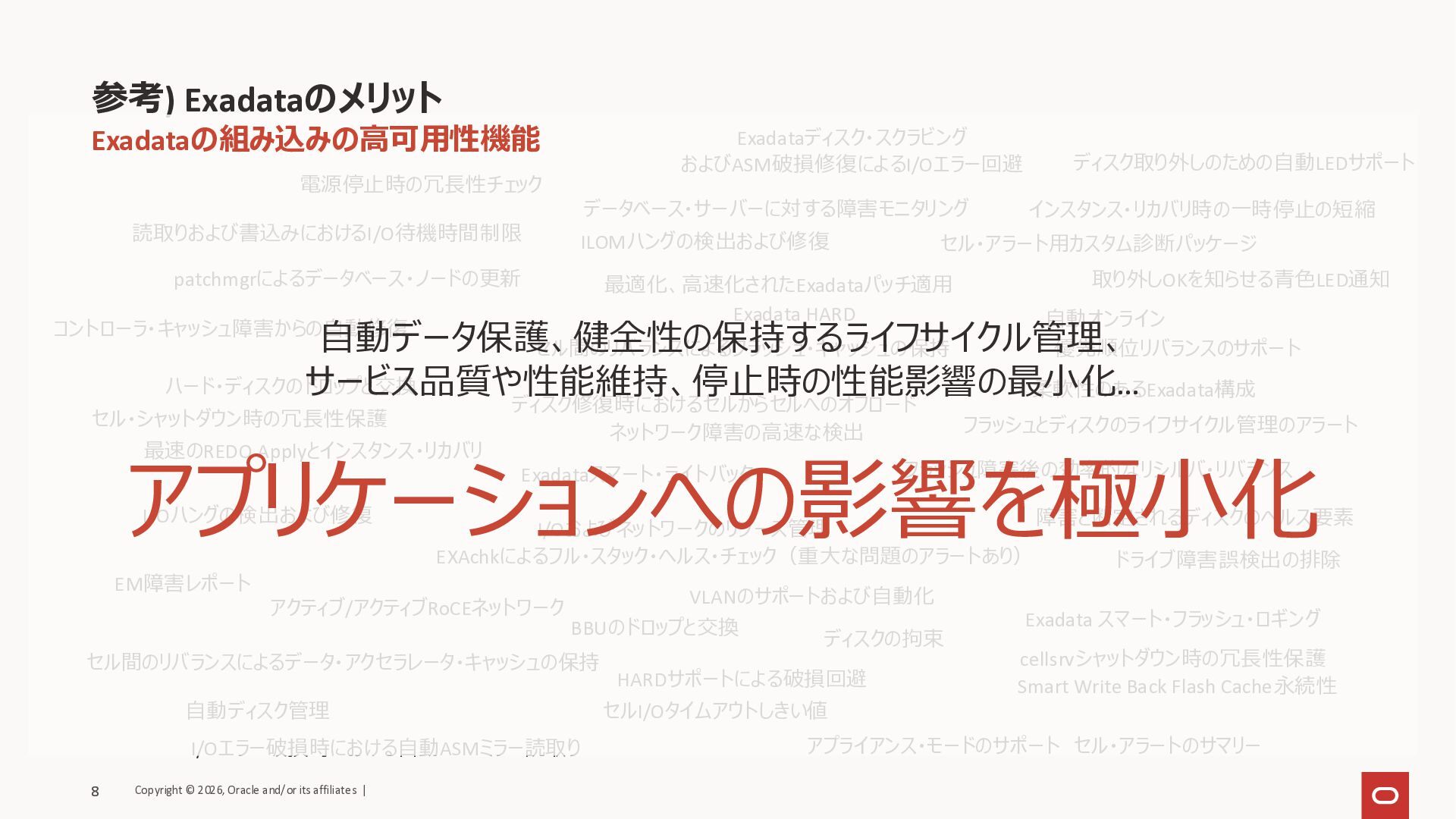 Clusterware : DBのクラスタリング • Service : データベース・サービスを複数ノード上で抽象化 • SCAN Listener : 接続サービスをクラスタレベルで抽象化 • Automatic Storage Management : 堅牢な共有ストレージ管理 • 内部ネットワーク : Active-Active RoCE ファブリック 様々な可用性機能がデフォルトで有効 • データ保護のためのチェック機能: ブロック破損や書き込み欠損のチェック • Flashback Database : バックアップのリストアよりも短いRTOでの復旧 可用性構成を簡単に構築可能 • RMAN: Oracle Databaseを安全に確実にリストアするためのバックアップ機能 • Zero Data Loss Autonomous Recovery Service : 短いRTO/RPOでの復旧 • Active Data Guard: 参照利用*可能で自動修復*を備えたDBレプリケーション機能 Exadata Database ServiceのSLA/SLO Exadata Database Service Oracle Databaseの高可用性プラクティスが詰まったExadata 7 Oracle Clusterware Real Application Clusters Service Automatic Storage Management SCAN Listener 可用性 > 99.95% 管理性 > 99.95% https://www.oracle.com/jp/cloud/sla/ デフォルトで各コンポーネントが冗長化 Copyright © 2026, Oracle and/or its affiliates | 7
