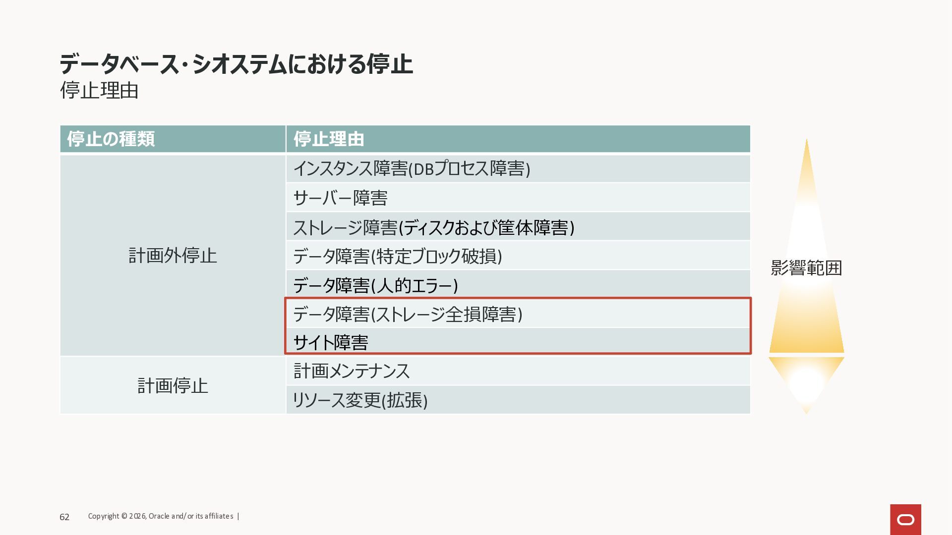 サイト障害 計画停止 計画メンテナンス リソース変更(拡張) データベース・シオステムにおける停止 影響範囲 Copyright © 2026, Oracle and/or its affiliates | 62