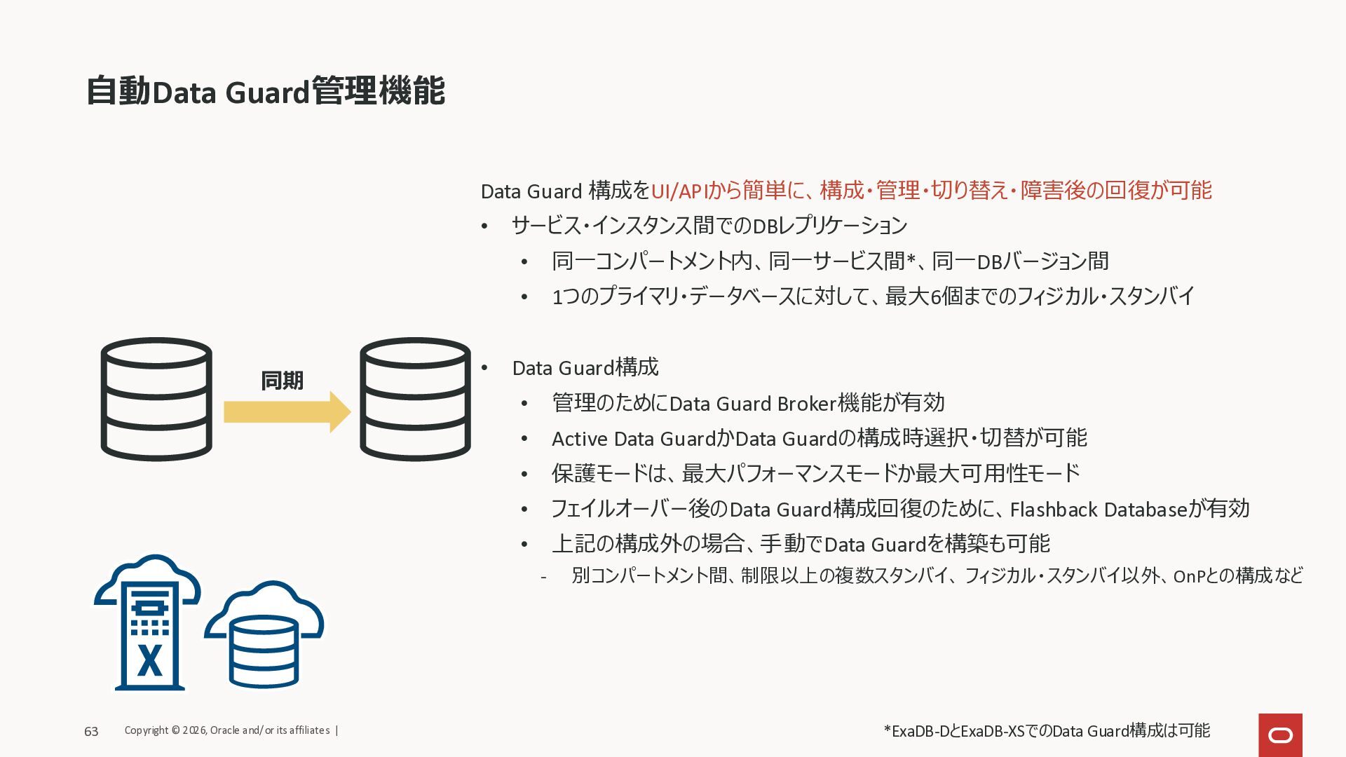 Data Guard構成 • 管理のためにData Guard Broker機能が有効 • Active Data GuardかData Guardの構成時選択・切替が可能 • 保護モードは、最大パフォーマンスモードか最大可用性モード • フェイルオーバー後のData Guard構成回復のために、Flashback Databaseが有効 • 上記の構成外の場合、手動でData Guardを構築も可能 - 別コンパートメント間、制限以上の複数スタンバイ、 フィジカル・スタンバイ以外、OnPとの構成など 自動Data Guard管理機能 同期 Copyright © 2026, Oracle and/or its affiliates | 63 *ExaDB-DとExaDB-XSでのData Guard構成は可能