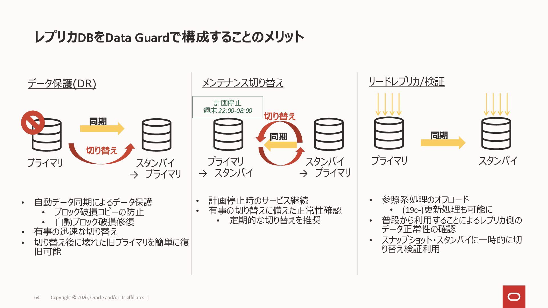 • 切り替え後に壊れた旧プライマリを簡単に復 旧可能 • 計画停止時のサービス継続 • 有事の切り替えに備えた正常性確認 • 定期的な切り替えを推奨 プライマリ スタンバイ → プライマリ 同期 切り替え 計画停止 週末 22:00-08:00 データ保護(DR) メンテナンス切り替え プライマリ → スタンバイ スタンバイ → プライマリ 同期 切り替え Copyright © 2026, Oracle and/or its affiliates | 64 • 参照系処理のオフロード • (19c-)更新処理も可能に • 普段から利用することによるレプリカ側の データ正常性の確認 • スナップショット・スタンバイに一時的に切 り替え検証利用 同期 リードレプリカ/検証 プライマリ スタンバイ