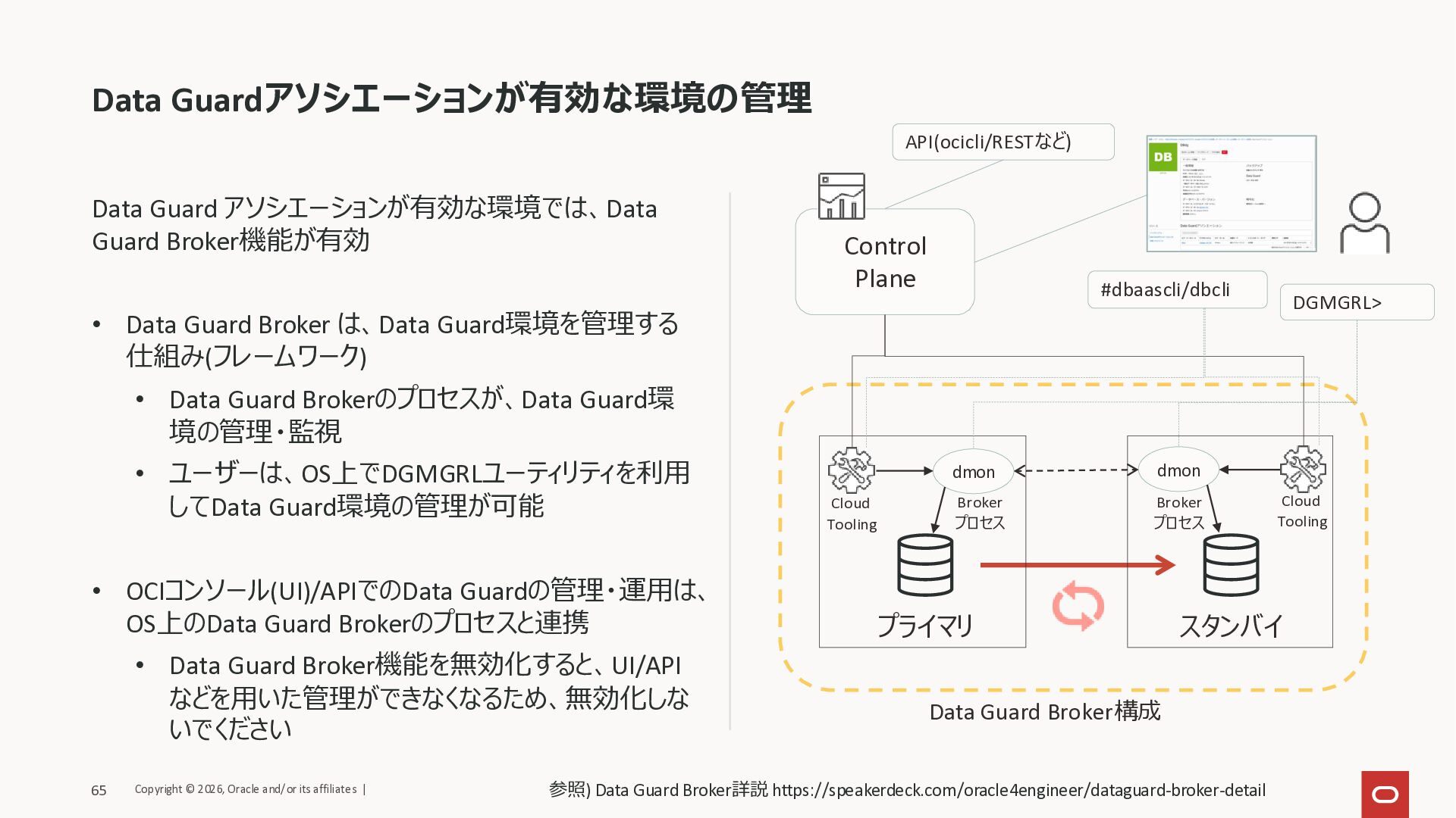 Broker は、Data Guard環境を管理する 仕組み(フレームワーク) • Data Guard Brokerのプロセスが、Data Guard環 境の管理・監視 • ユーザーは、OS上でDGMGRLユーティリティを利用 してData Guard環境の管理が可能 • OCIコンソール(UI)/APIでのData Guardの管理・運用は、 OS上のData Guard Brokerのプロセスと連携 • Data Guard Broker機能を無効化すると、UI/API などを用いた管理ができなくなるため、無効化しな いでください Control Plane プライマリ スタンバイ Data Guard Broker構成 dmon dmon Cloud Tooling Cloud Tooling Broker プロセス Broker プロセス DGMGRL> #dbaascli/dbcli API(ocicli/RESTなど) Copyright © 2026, Oracle and/or its affiliates | 65 参照) Data Guard Broker詳説 https://speakerdeck.com/oracle4engineer/dataguard-broker-detail