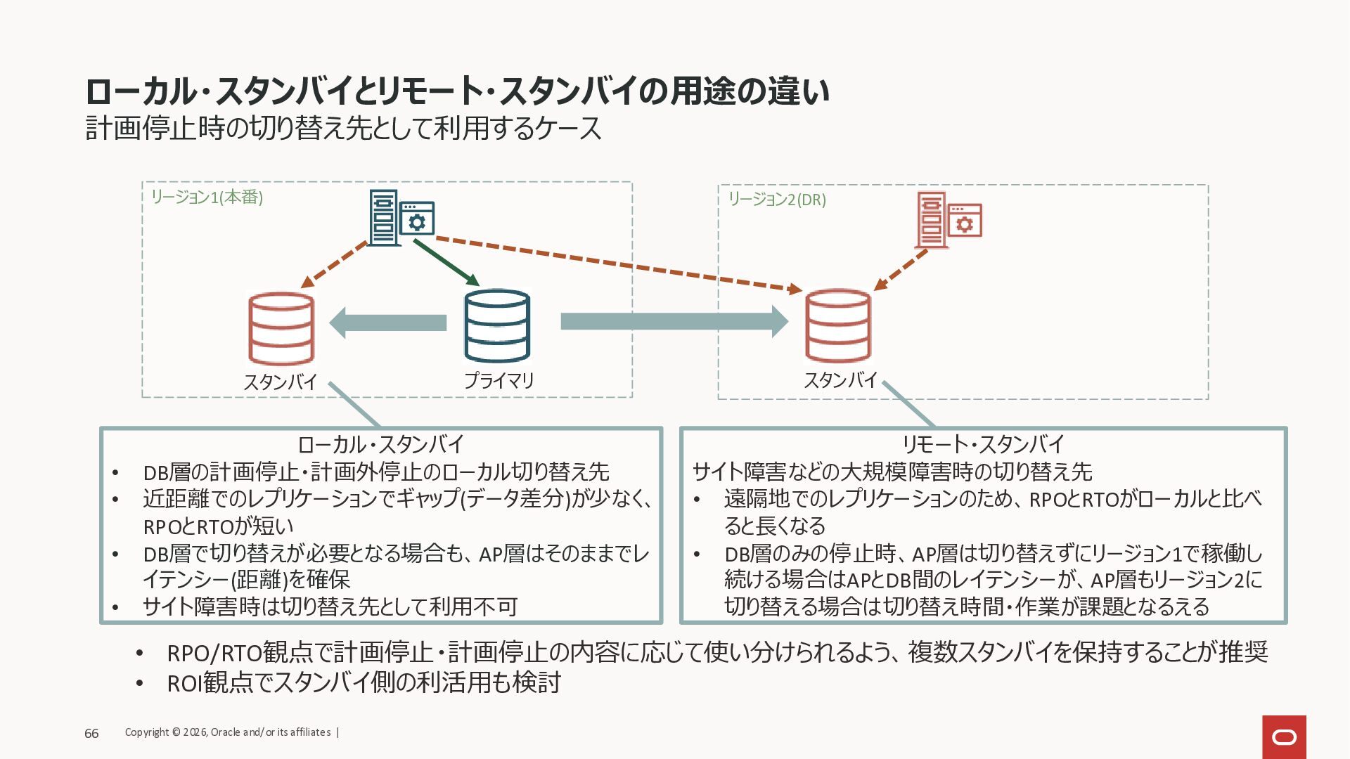 • DB層で切り替えが必要となる場合も、AP層はそのままでレ イテンシー(距離)を確保 • サイト障害時は切り替え先として利用不可 リモート・スタンバイ サイト障害などの大規模障害時の切り替え先 • 遠隔地でのレプリケーションのため、RPOとRTOがローカルと比べ ると長くなる • DB層のみの停止時、AP層は切り替えずにリージョン1で稼働し 続ける場合はAPとDB間のレイテンシーが、AP層もリージョン2に 切り替える場合は切り替え時間・作業が課題となるえる • RPO/RTO観点で計画停止・計画停止の内容に応じて使い分けられるよう、複数スタンバイを保持することが推奨 • ROI観点でスタンバイ側の利活用も検討 プライマリ スタンバイ スタンバイ Copyright © 2026, Oracle and/or its affiliates | 66