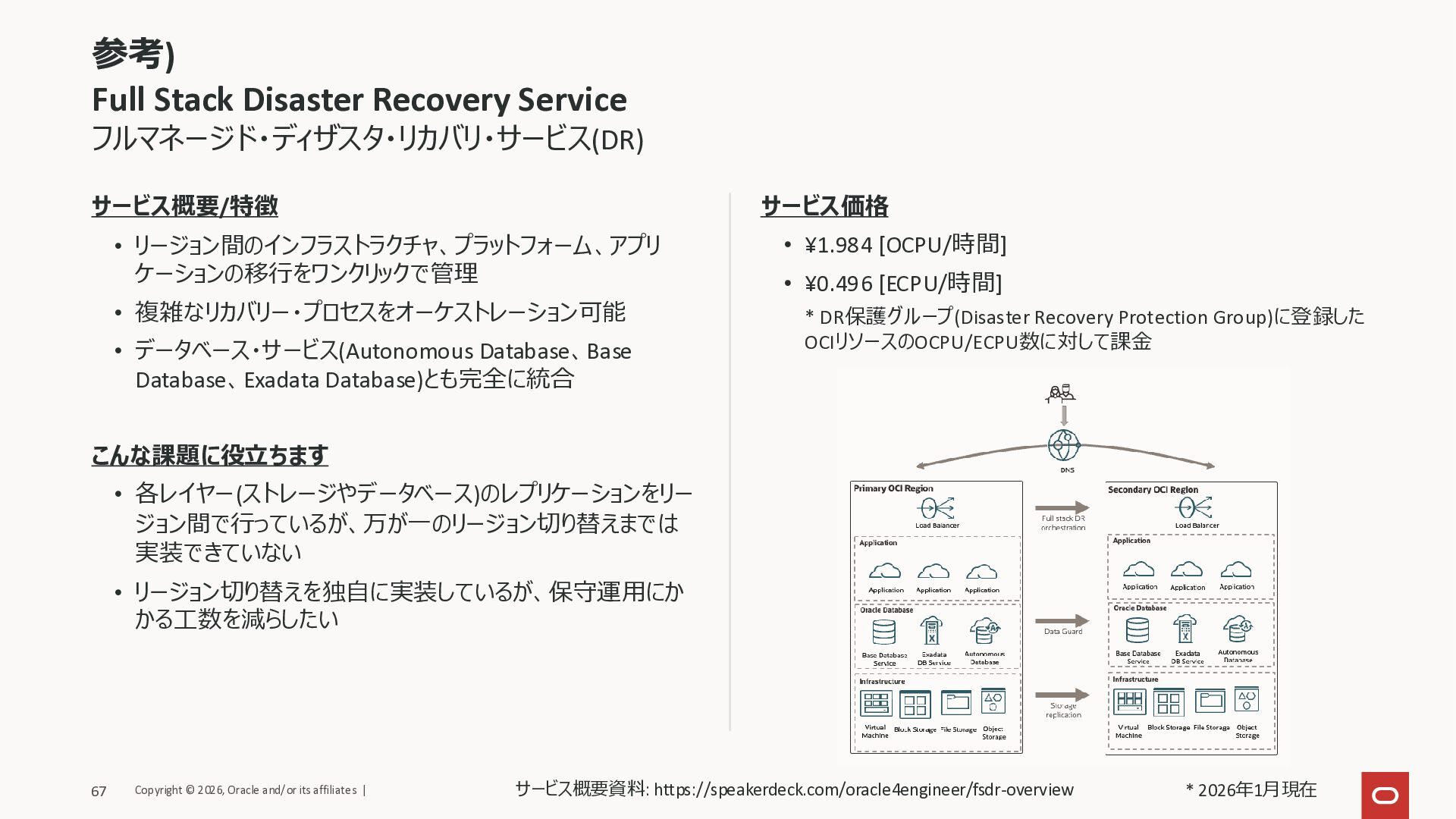 • 複雑なリカバリー・プロセスをオーケストレーション可能 • データベース・サービス(Autonomous Database、Base Database、Exadata Database)とも完全に統合 こんな課題に役立ちます • 各レイヤー(ストレージやデータベース)のレプリケーションをリー ジョン間で行っているが、万が一のリージョン切り替えまでは 実装できていない • リージョン切り替えを独自に実装しているが、保守運用にか かる工数を減らしたい サービス価格 • ¥1.984 [OCPU/時間] • ¥0.496 [ECPU/時間] * DR保護グループ(Disaster Recovery Protection Group)に登録した OCIリソースのOCPU/ECPU数に対して課金 フルマネージド・ディザスタ・リカバリ・サービス(DR) * 2026年1月現在 Copyright © 2026, Oracle and/or its affiliates | 67 サービス概要資料: https://speakerdeck.com/oracle4engineer/fsdr-overview