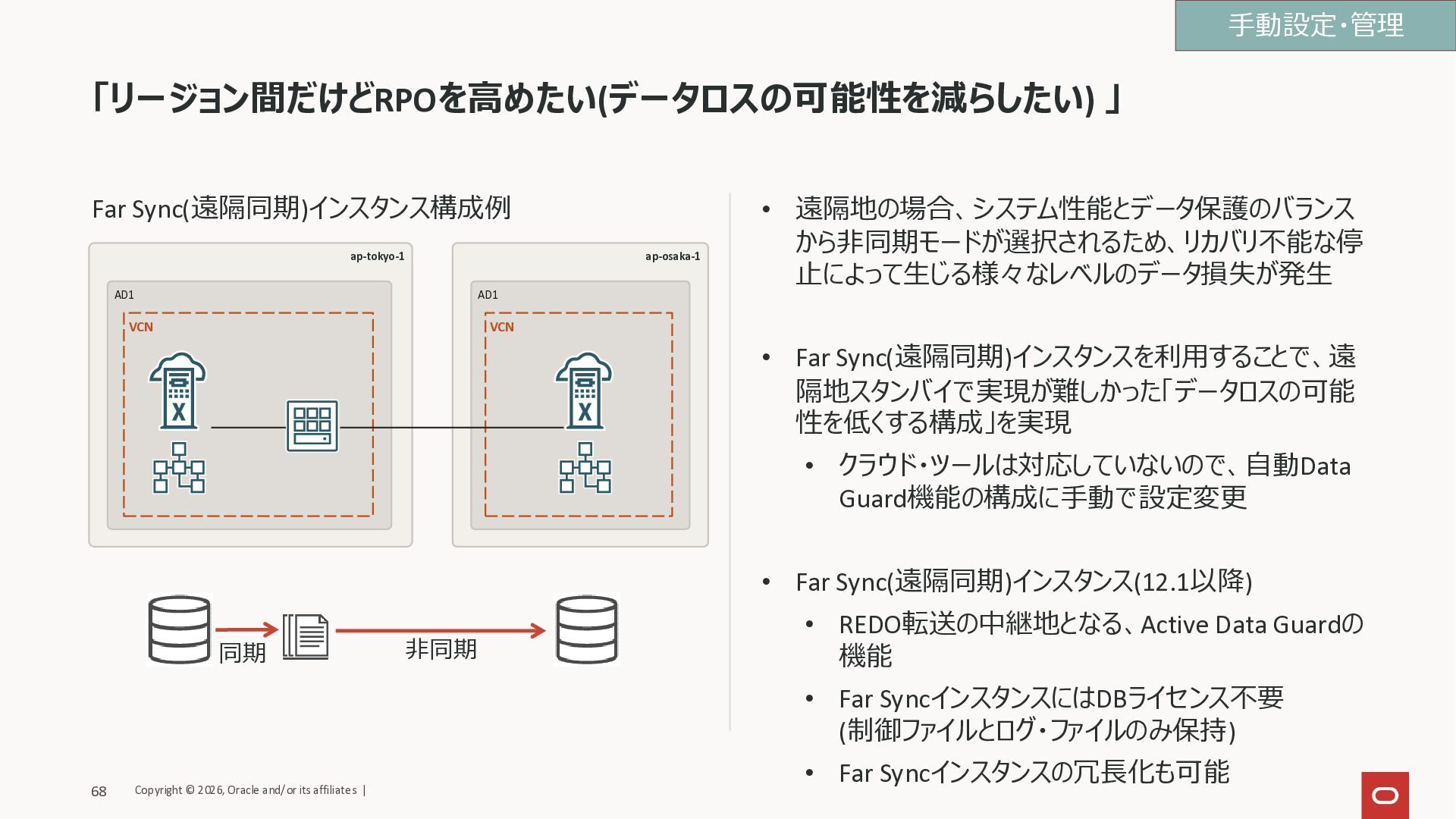 Sync(遠隔同期)インスタンスを利用することで、遠 隔地スタンバイで実現が難しかった「データロスの可能 性を低くする構成」を実現 • クラウド・ツールは対応していないので、自動Data Guard機能の構成に手動で設定変更 • Far Sync(遠隔同期)インスタンス(12.1以降) • REDO転送の中継地となる、Active Data Guardの 機能 • Far SyncインスタンスにはDBライセンス不要 (制御ファイルとログ・ファイルのみ保持) • Far Syncインスタンスの冗長化も可能 ap-tokyo-1 AD1 VCN ap-osaka-1 AD1 VCN 同期 非同期 手動設定・管理 Copyright © 2026, Oracle and/or its affiliates | 68