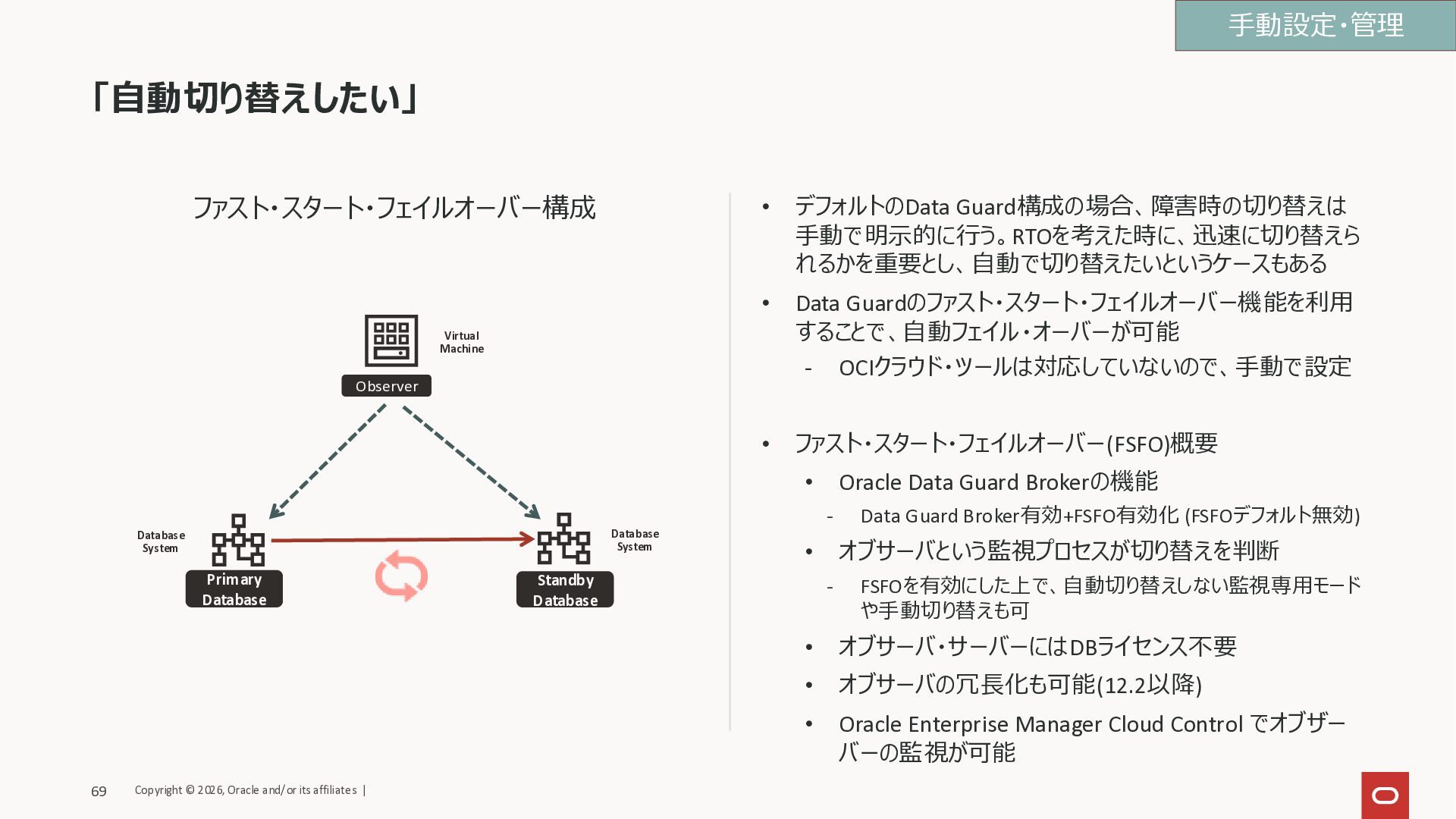することで、自動フェイル・オーバーが可能 - OCIクラウド・ツールは対応していないので、手動で設定 • ファスト・スタート・フェイルオーバー(FSFO)概要 • Oracle Data Guard Brokerの機能 - Data Guard Broker有効+FSFO有効化 (FSFOデフォルト無効) • オブサーバという監視プロセスが切り替えを判断 - FSFOを有効にした上で、自動切り替えしない監視専用モード や手動切り替えも可 • オブサーバ・サーバーにはDBライセンス不要 • オブサーバの冗長化も可能(12.2以降) • Oracle Enterprise Manager Cloud Control でオブザー バーの監視が可能 手動設定・管理 Database System Database System Virtual Machine Observer Primary Database Standby Database Copyright © 2026, Oracle and/or its affiliates | 69
