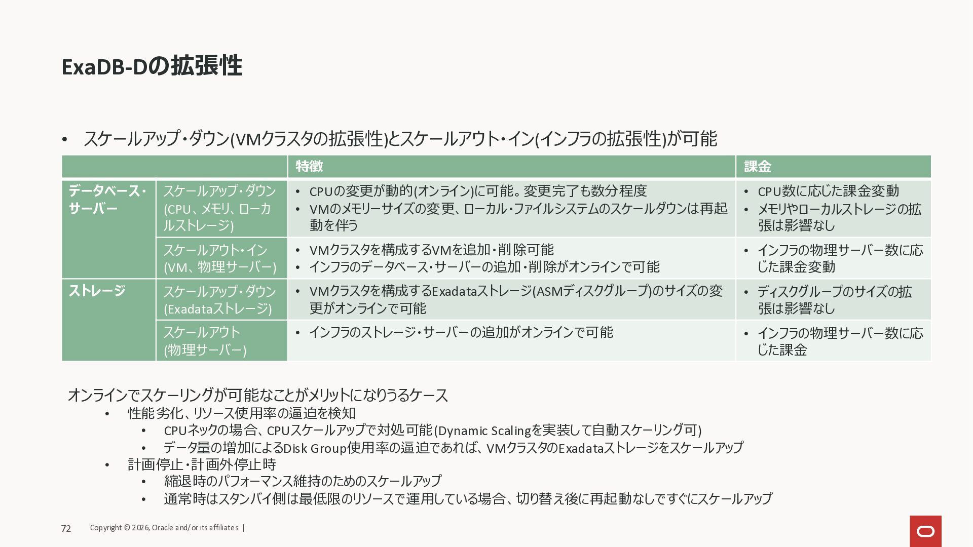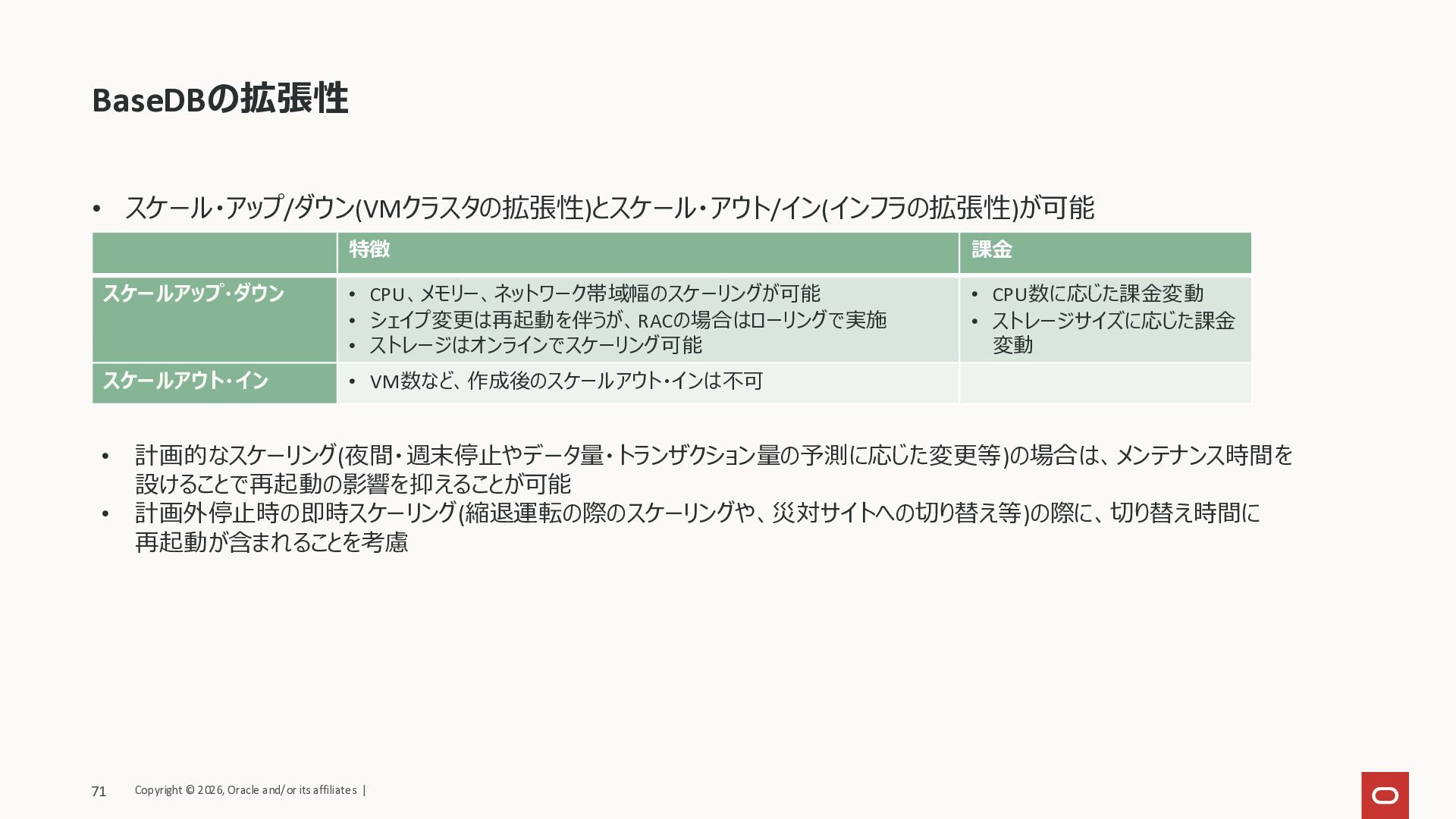 • ストレージはオンラインでスケーリング可能 • CPU数に応じた課金変動 • ストレージサイズに応じた課金 変動 スケールアウト・イン • VM数など、作成後のスケールアウト・インは不可 • 計画的なスケーリング(夜間・週末停止やデータ量・トランザクション量の予測に応じた変更等)の場合は、メンテナンス時間を 設けることで再起動の影響を抑えることが可能 • 計画外停止時の即時スケーリング(縮退運転の際のスケーリングや、災対サイトへの切り替え等)の際に、切り替え時間に 再起動が含まれることを考慮 Copyright © 2026, Oracle and/or its affiliates | 71