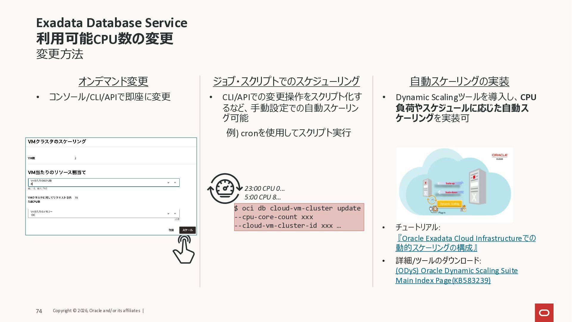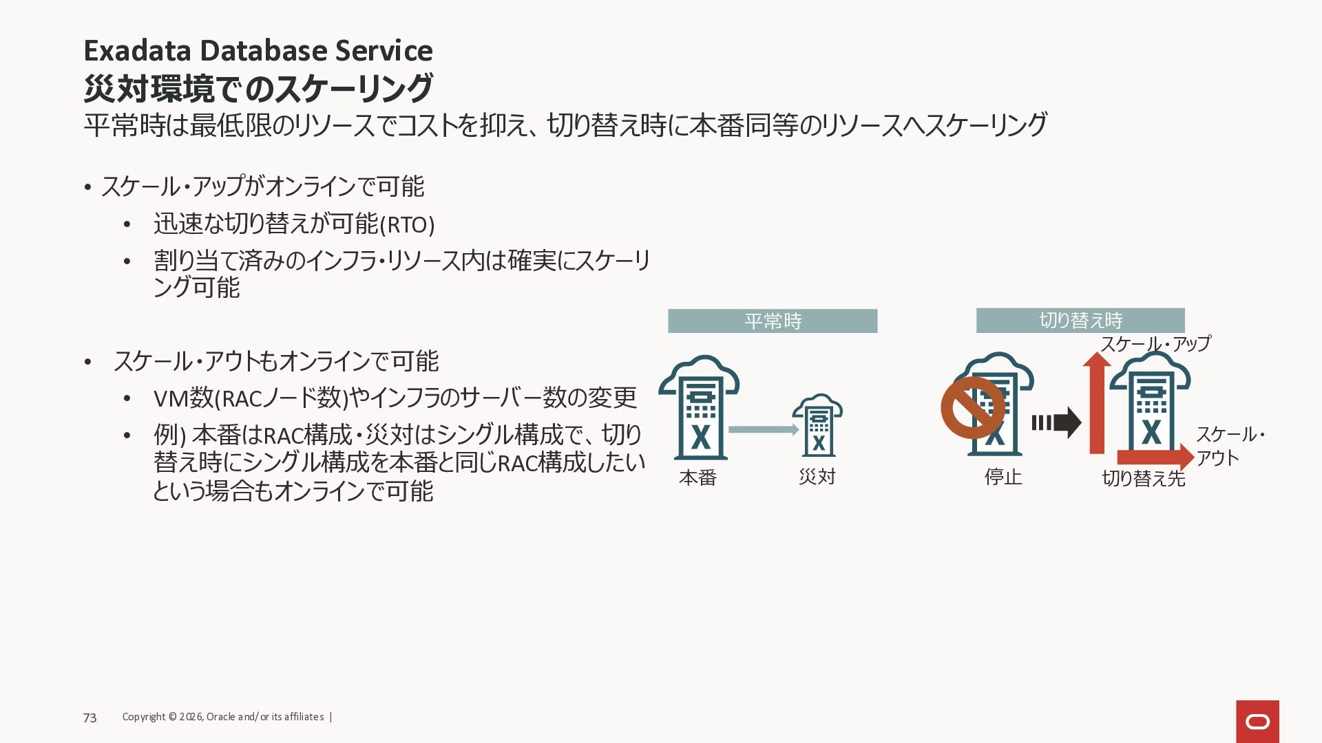• CPUの変更が動的(オンライン)に可能。変更完了も数分程度 • VMのメモリーサイズの変更、ローカル・ファイルシステムのスケールダウンは再起 動を伴う • CPU数に応じた課金変動 • メモリやローカルストレージの拡 張は影響なし スケールアウト・イン (VM、物理サーバー) • VMクラスタを構成するVMを追加・削除可能 • インフラのデータベース・サーバーの追加・削除がオンラインで可能 • インフラの物理サーバー数に応 じた課金変動 ストレージ スケールアップ・ダウン (Exadataストレージ) • VMクラスタを構成するExadataストレージ(ASMディスクグループ)のサイズの変 更がオンラインで可能 • ディスクグループのサイズの拡 張は影響なし スケールアウト (物理サーバー) • インフラのストレージ・サーバーの追加がオンラインで可能 • インフラの物理サーバー数に応 じた課金 オンラインでスケーリングが可能なことがメリットになりうるケース • 性能劣化、リソース使用率の逼迫を検知 • CPUネックの場合、CPUスケールアップで対処可能(Dynamic Scalingを実装して自動スケーリング可) • データ量の増加によるDisk Group使用率の逼迫であれば、VMクラスタのExadataストレージをスケールアップ • 計画停止・計画外停止時 • 縮退時のパフォーマンス維持のためのスケールアップ • 通常時はスタンバイ側は最低限のリソースで運用している場合、切り替え後に再起動なしですぐにスケールアップ Copyright © 2026, Oracle and/or its affiliates | 72