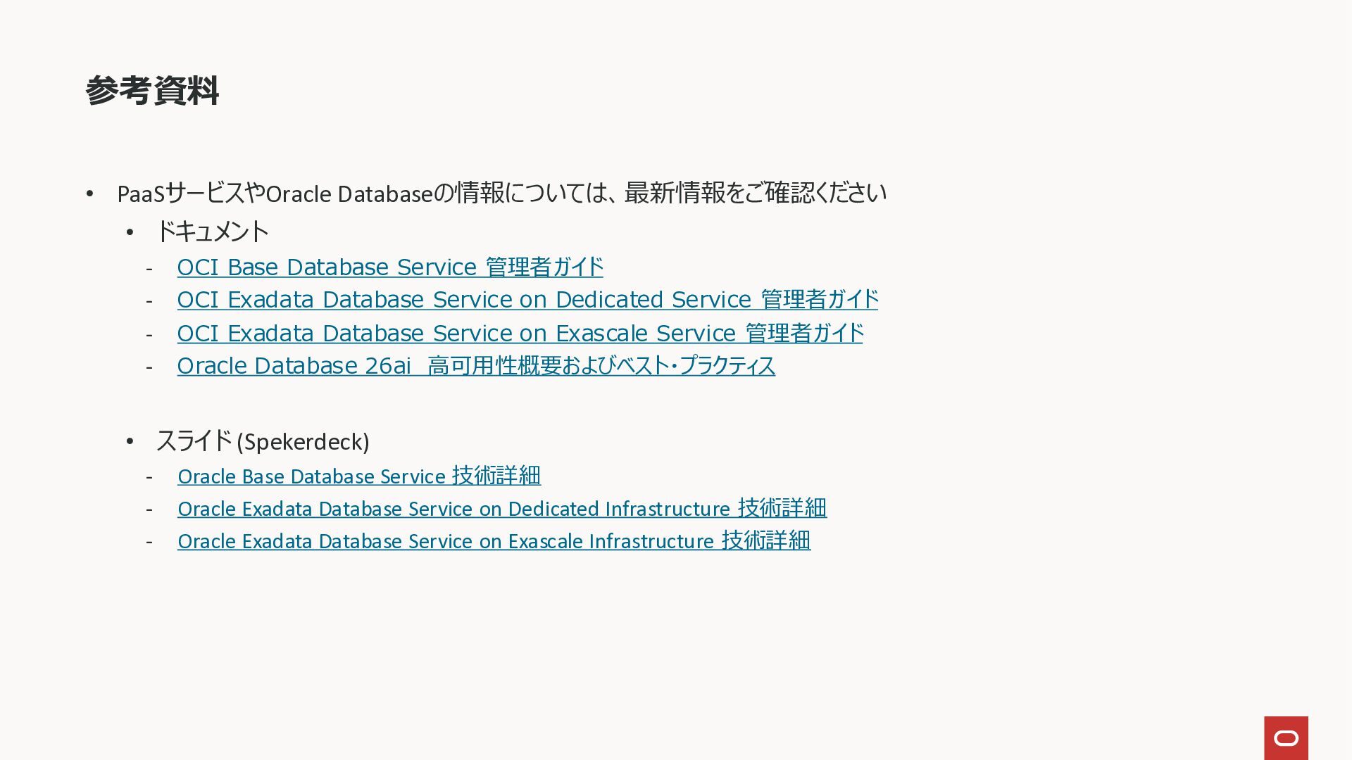 Service 管理者ガイド - OCI Exadata Database Service on Dedicated Service 管理者ガイド - OCI Exadata Database Service on Exascale Service 管理者ガイド - Oracle Database 26ai 高可用性概要およびベスト・プラクティス • スライド (Spekerdeck) - Oracle Base Database Service 技術詳細 - Oracle Exadata Database Service on Dedicated Infrastructure 技術詳細 - Oracle Exadata Database Service on Exascale Infrastructure 技術詳細